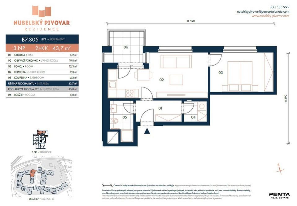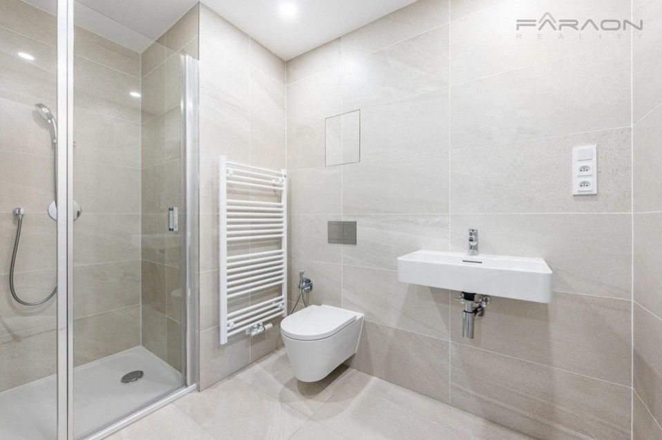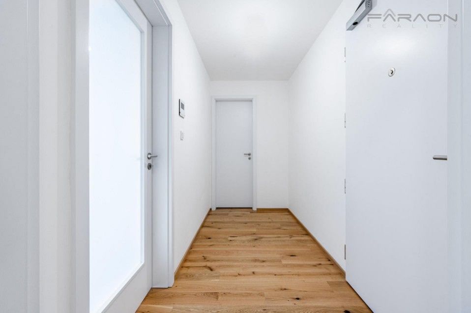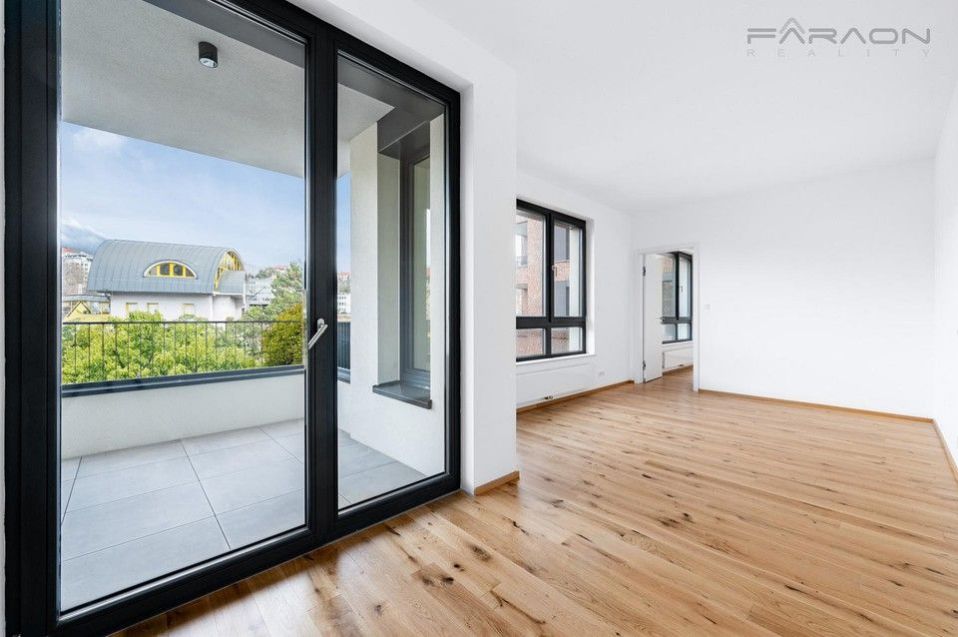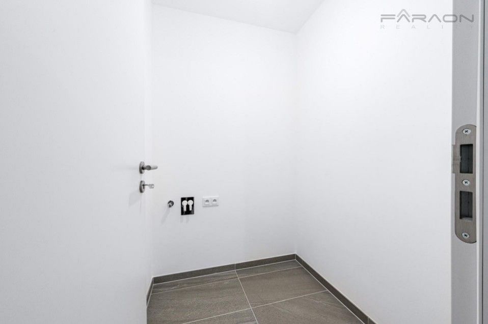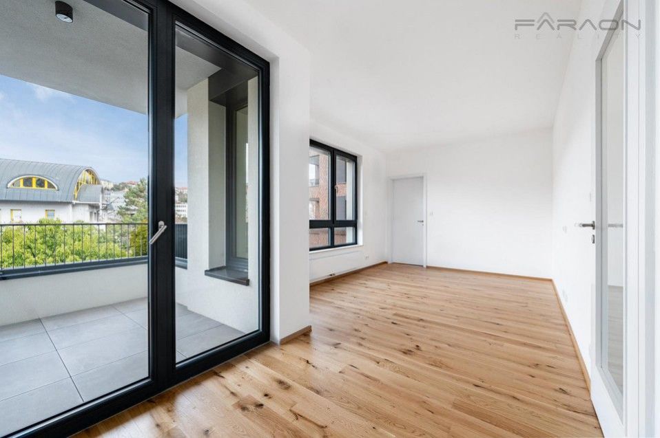 Dispozici slunného bytu 2KK zahrnuje otevřený koncept obývacího pokoje s kuchyní a přímým vstupem na terasu, další samostatný pokoj, vstupní chodba, prostorná koupelna se sprchovým koutem, úklidová místnost - místnost pro pračku, sušičku, sklep a parkovací místo.