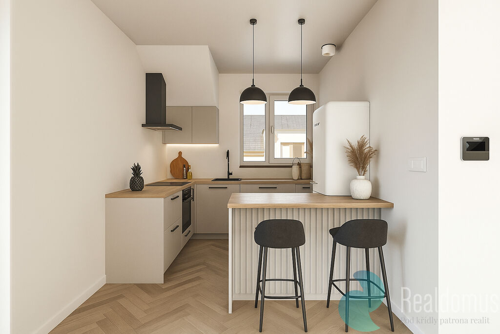 V ceně bytu jsou zahrnuty podlahy, dveře, obklady i sanita, a tak vám už zbývá jen "doladit" kuchyni dle svého...