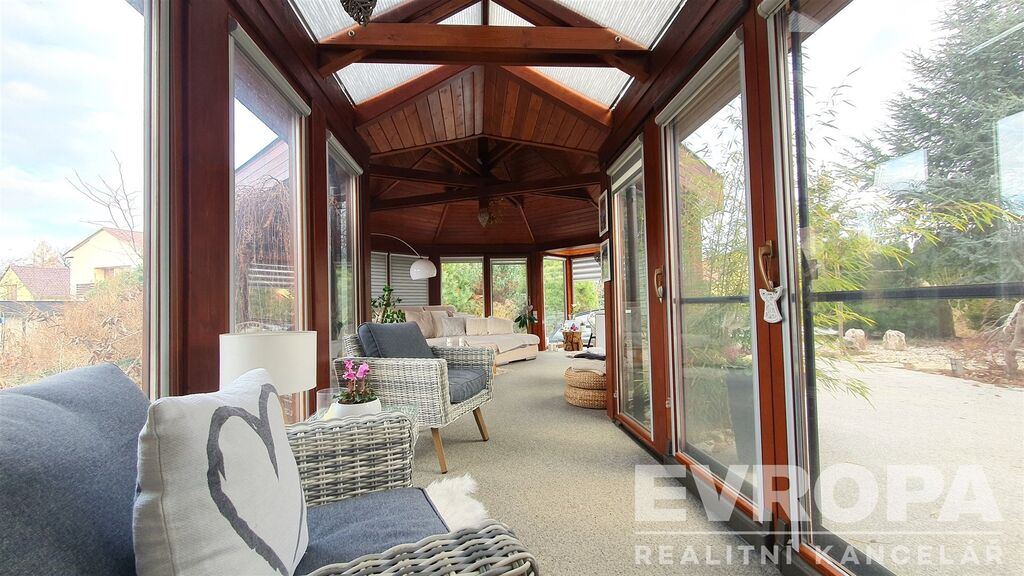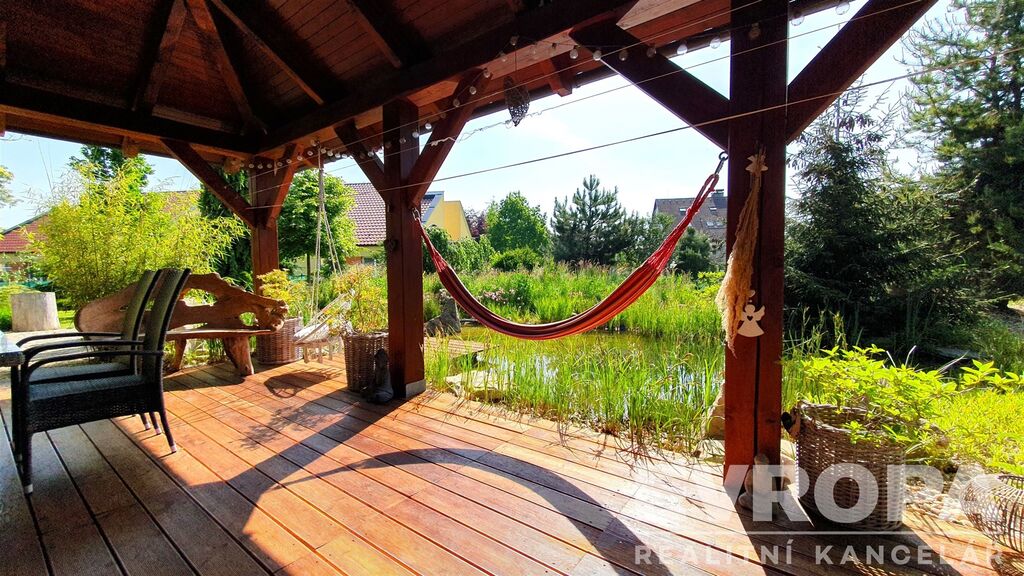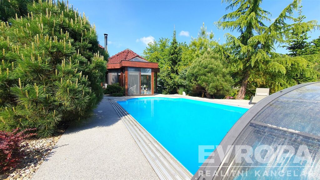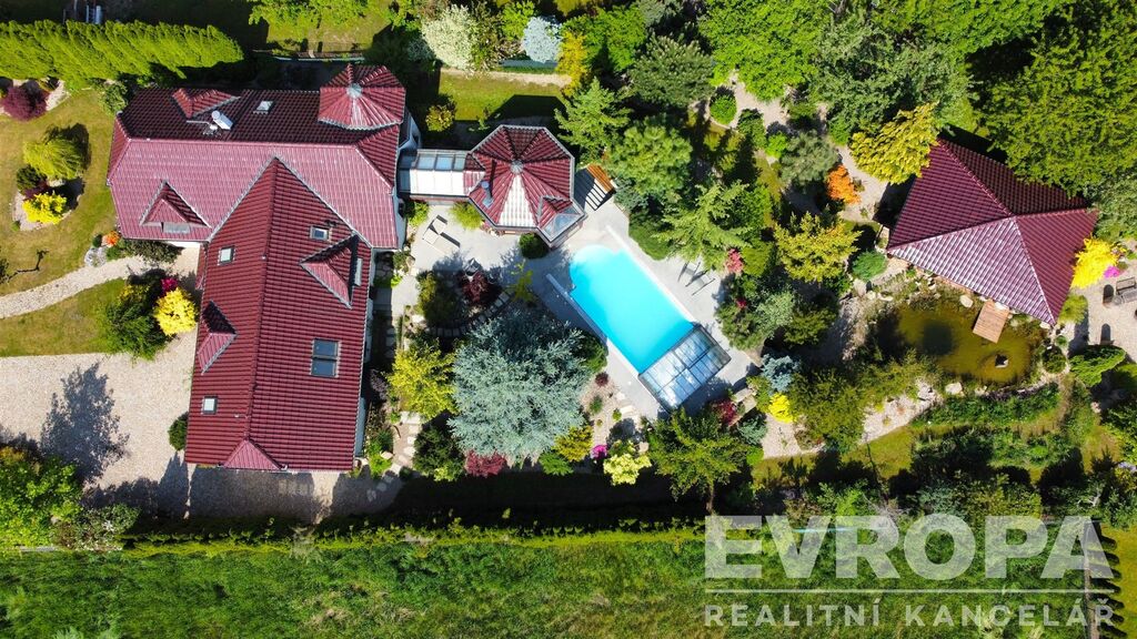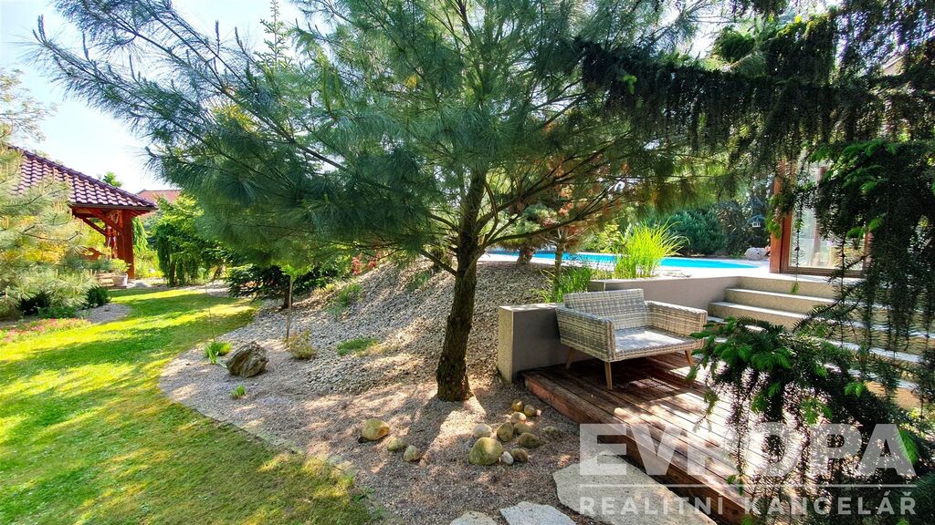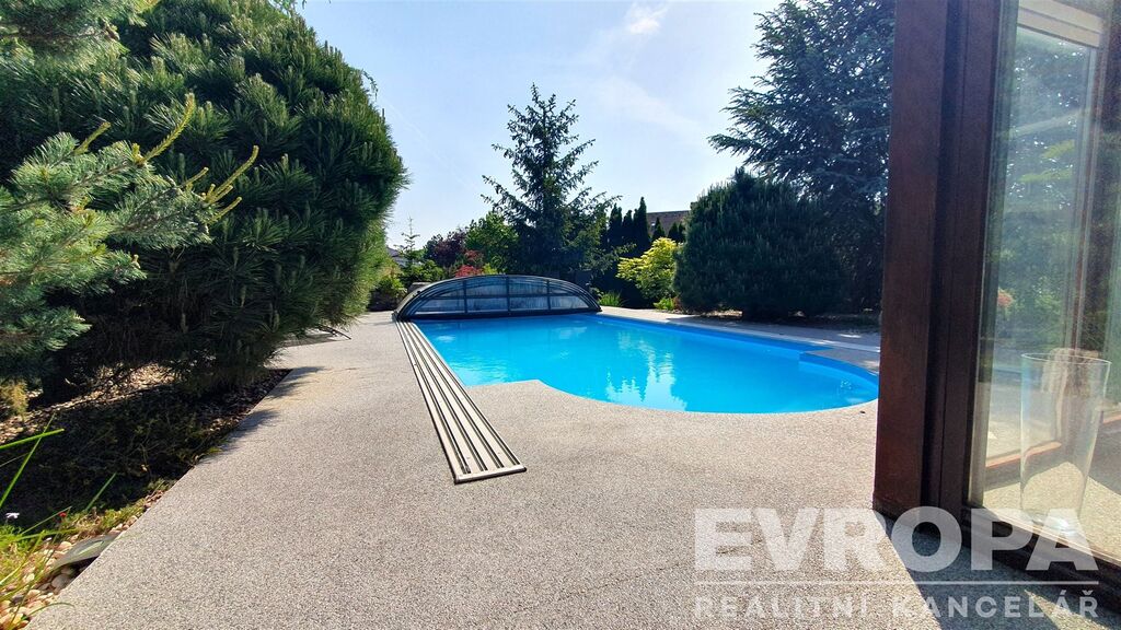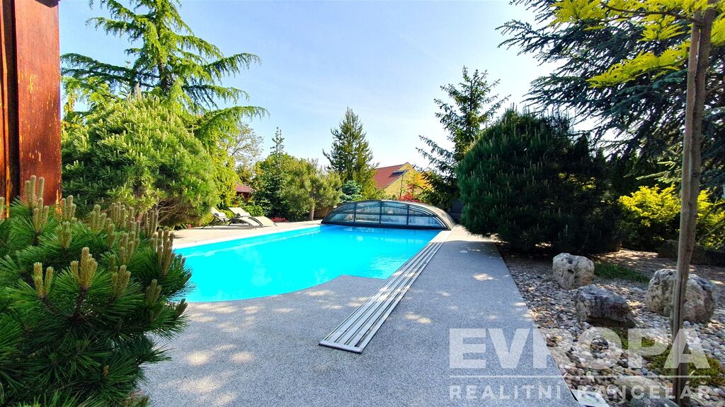 Zajímavostí je venkovní bazén s plochou 45 m² ideální pro rodinnou rekreaci během teplých letních dnů. Velká zahrada o rozloze 1944 m² poskytuje dostatek prostoru nejen pro relaxaci, ale i pro zahradnické aktivity a venkovní hry pro děti. Součástí pozemku je i garáž a čtyři další parkovací místa, což značně usnadňuje život majitelům více vozidel.