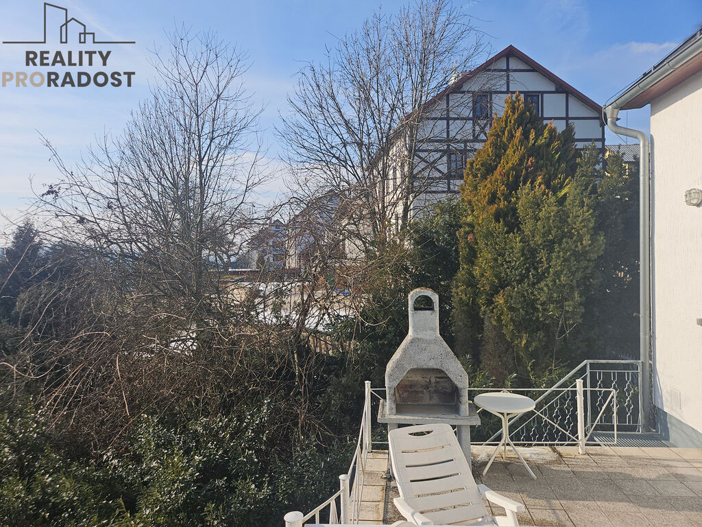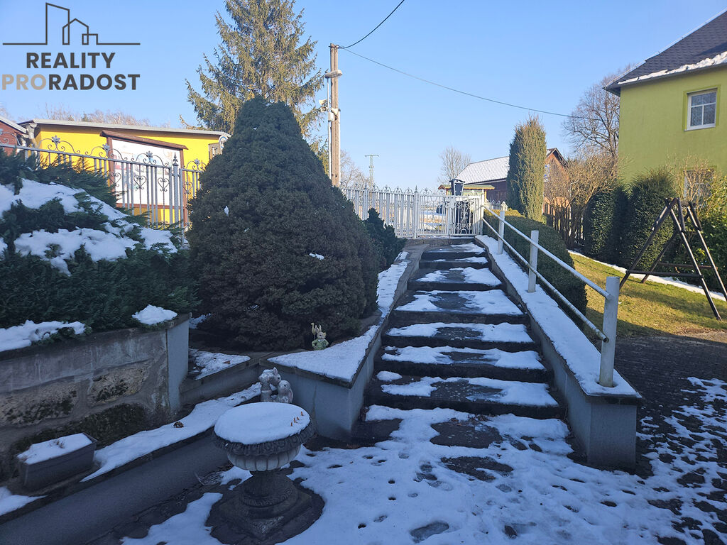 U domu rozlehlá svažitá zahrada s množstvím zeleně. Pozemek kolem dokola oplocen.