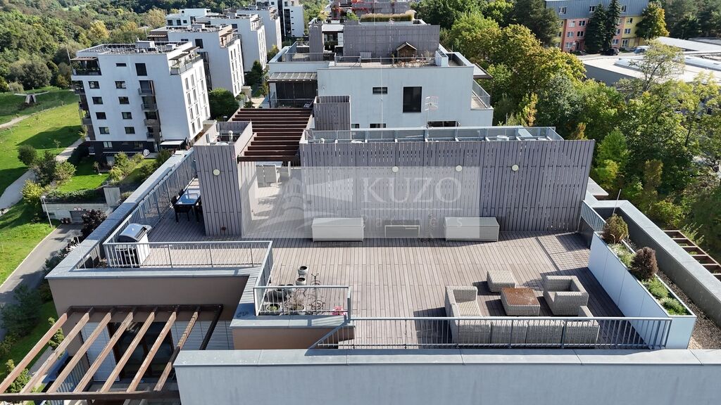 Obrovskou výhodou tohoto bytu o dispozici 4+kk o celkové velikosti 258 m2, z toho plocha bytu 119,7 m2, jsou tři terasy 16,5 m2, 13 m2 a střešní terasa 109,1 m2.