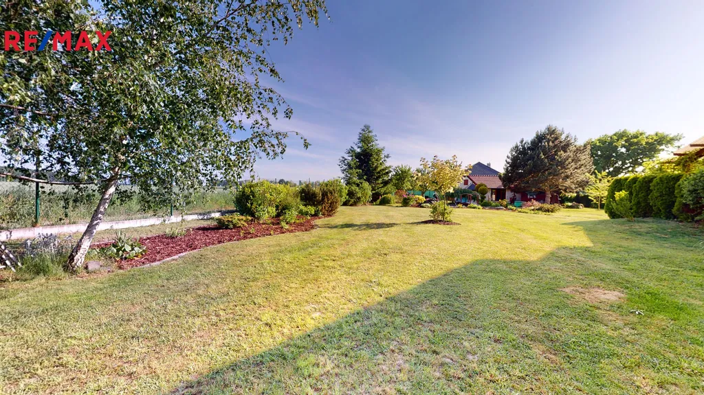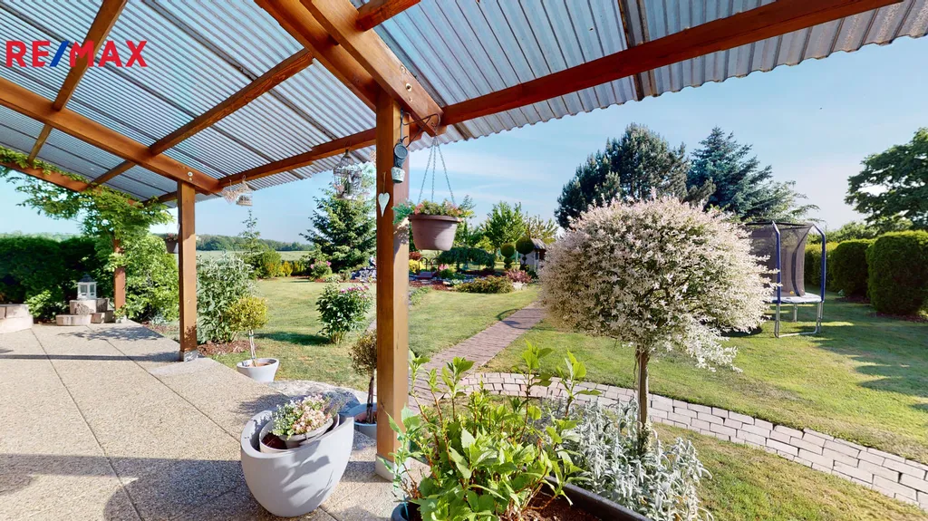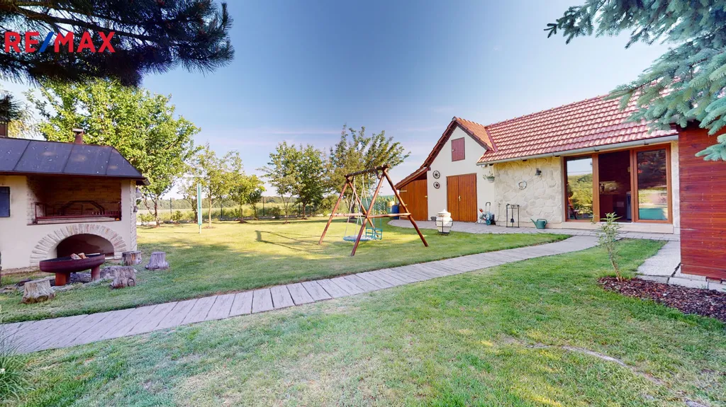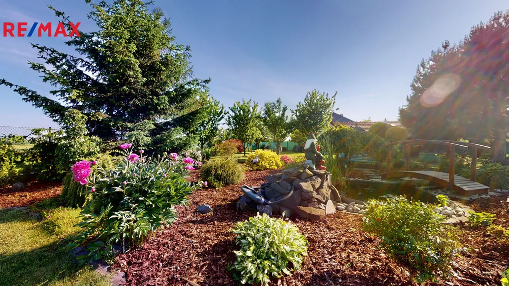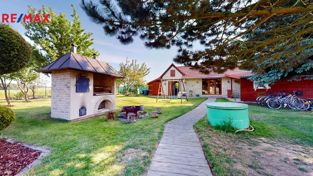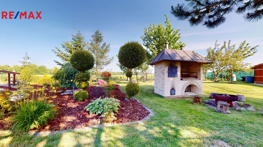 Za domem je vybudovaná okrasná zahrada, včetně zděného grilu, s udírnou, zahradního jezírka a kopané studny.