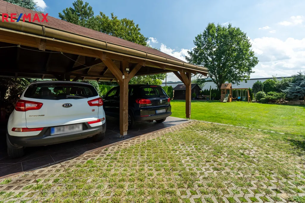 Součástí domu je garáž o rozloze 26 m² s připojenou dílnou a kryté parkovací stání pro dvě auta, takže parkování nebude nikdy problém.