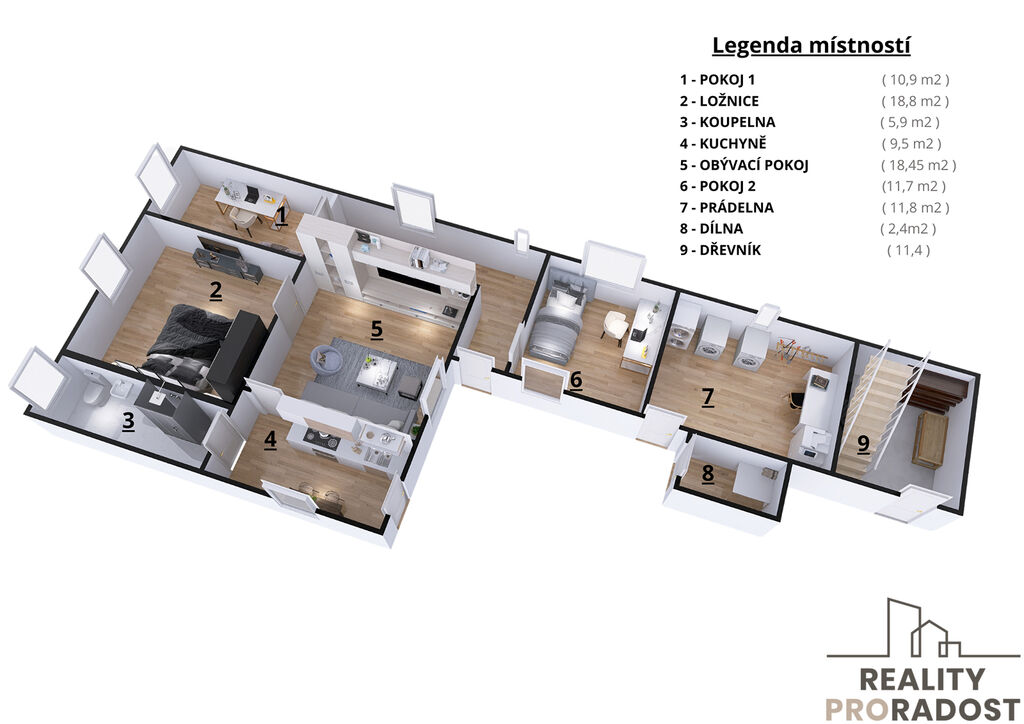 Nemovitost se může pochlubit zastavěnou plochou 157 m² a užitnou plochou 107 m² na pozemku o celkové ploše 269 m². V přízemí se nachází 4 pokoje včetně kuchyně a dalšího zázemí. Podkroví nabízí možnost rozšířit obytný prostor o další dva pokoje a nebo využít i velkou volnou půdu, a vytvořit tak útulné, prostorné bydlení podle vlastních představ.