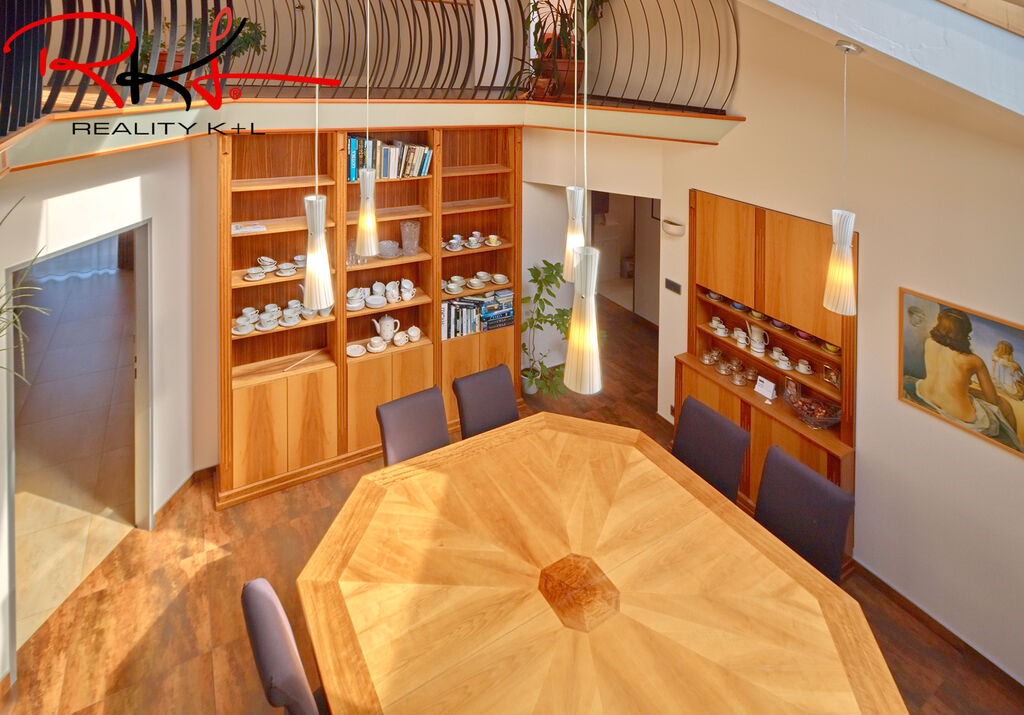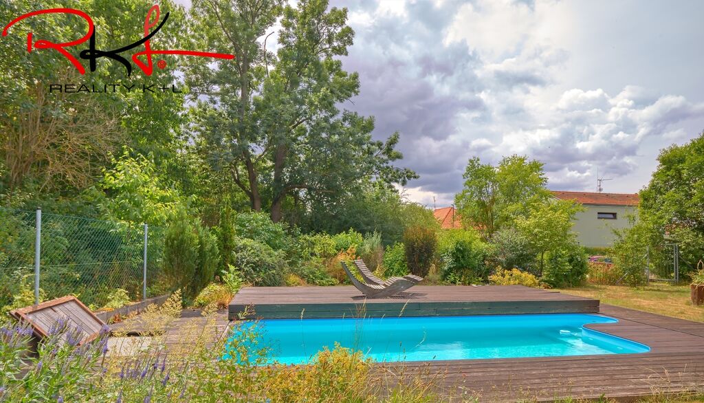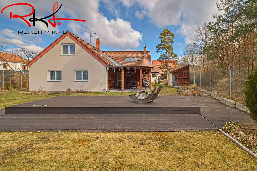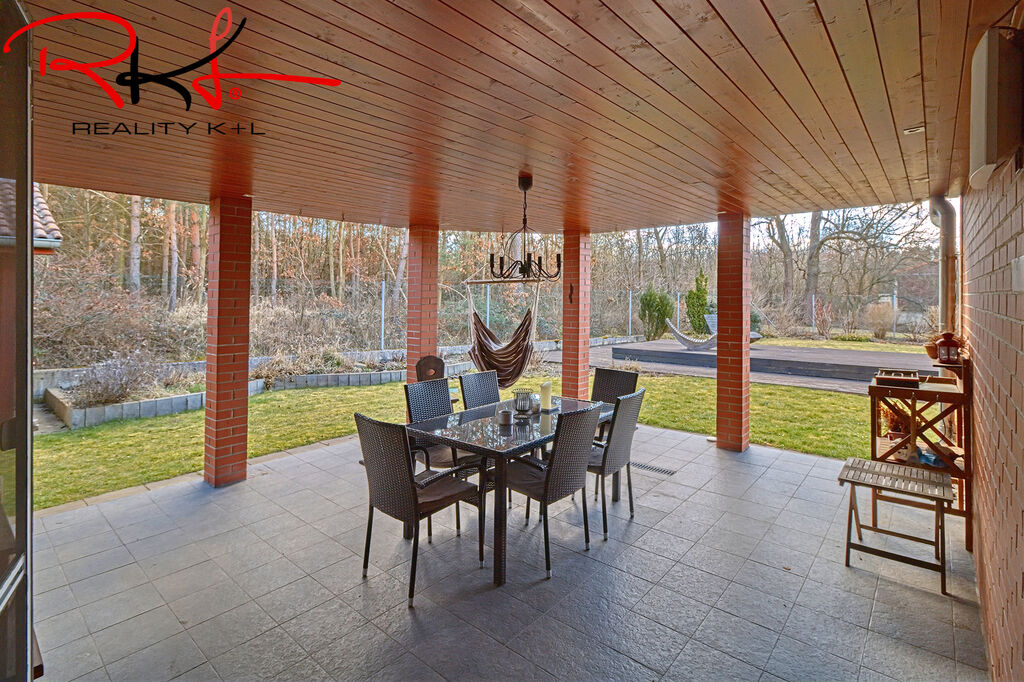 Dominantou domu je otevřené atrium s lávkou a výhledem na přízemí. Terasa u domu poskytuje ideální zázemí pro relaxaci. Na pozemku se nachází dvougaráž s dílnou, zastřešené stání pro karavan, zahradní domek na nářadí a studna. K dispozici je krytý venkovní bazén se schody, o rozměrech 6 × 3 m, hloubka 140 cm. Udržovaná okrasná zahrada disponuje automatickou závlahou.