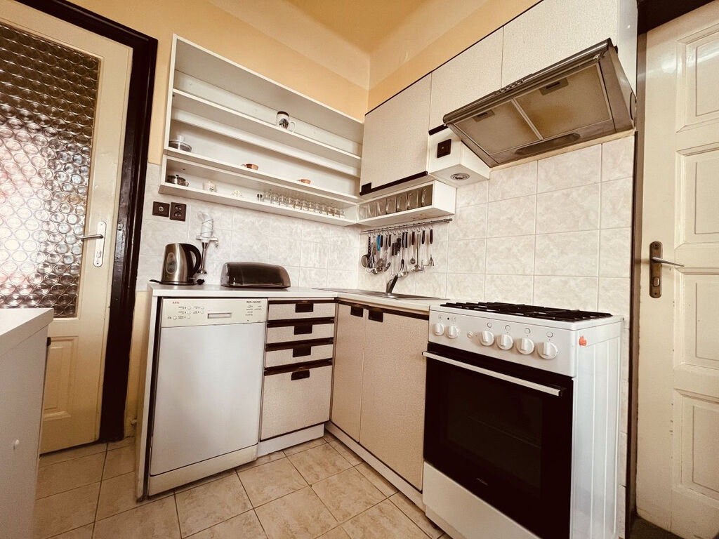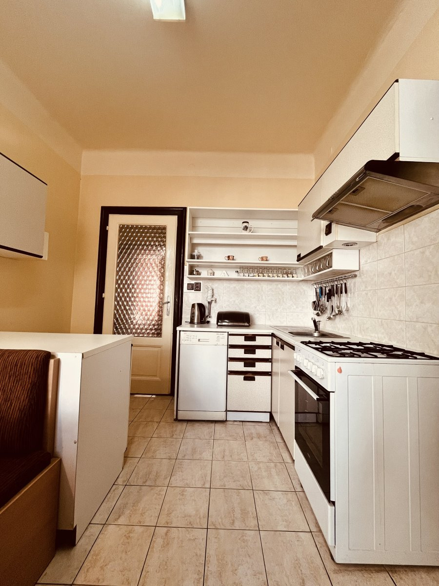V kuchyni je linka, elektrická trouba, plynový sporák, digestoř, myčka a také jídelní stůl s lavicemi. Z kuchyně se také dostaneme do samostatné spižírny s prostornými policemi.