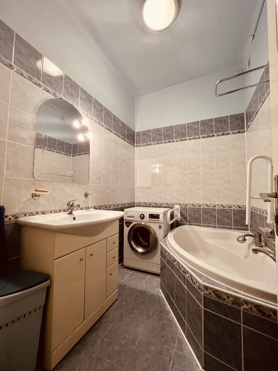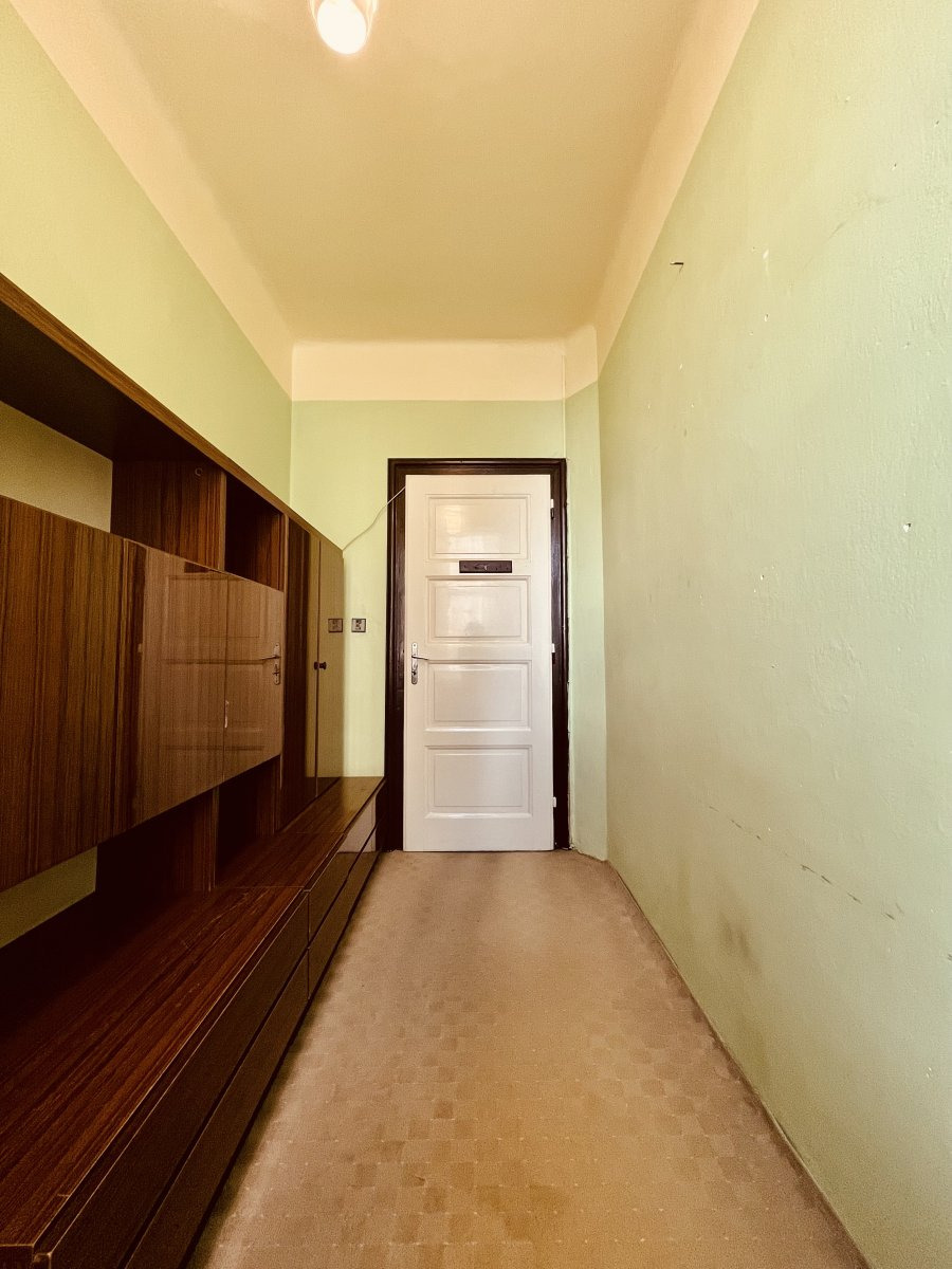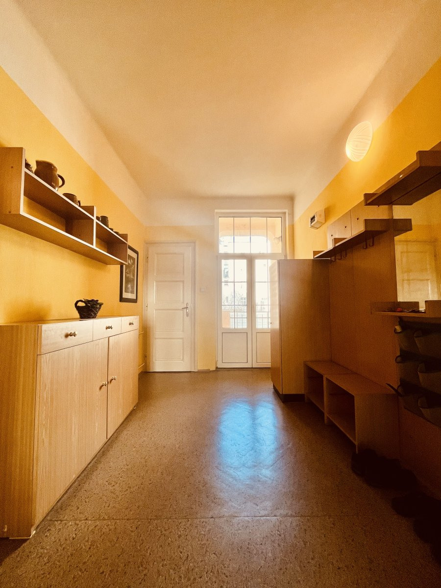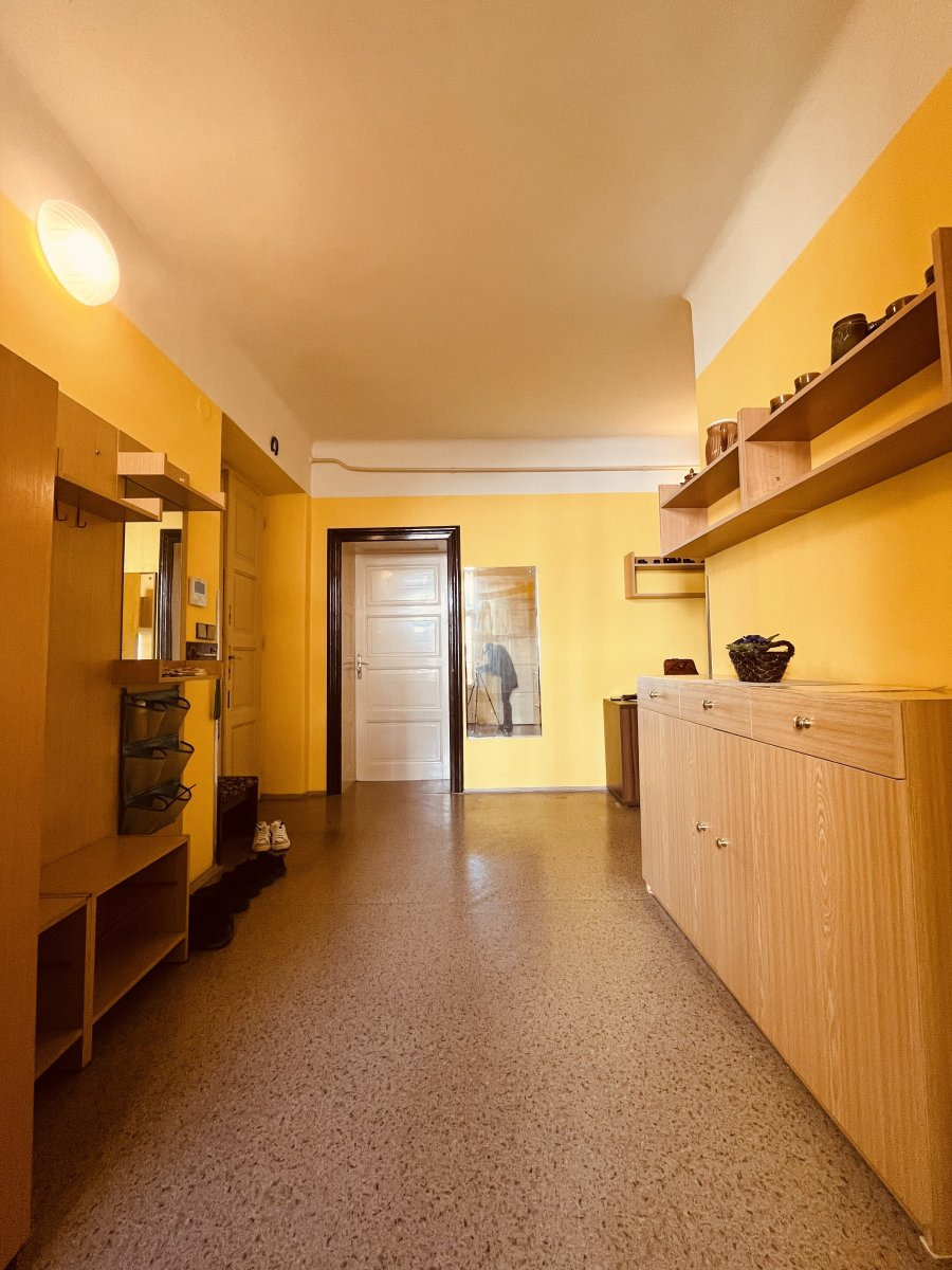 Interiér tvoří prostorná vstupní hala s komodami, skříní a lednicí naproti vstupu do kuchyně. Další vstupy nabízí jeden průchozí pokoj a tři pokoje neprůchozí. Vstup do koupelny s vanou a pračkou. Samostatnou toaletu a vstup na lodžii, kde je výhled do dvora klidného vnitrobloku.