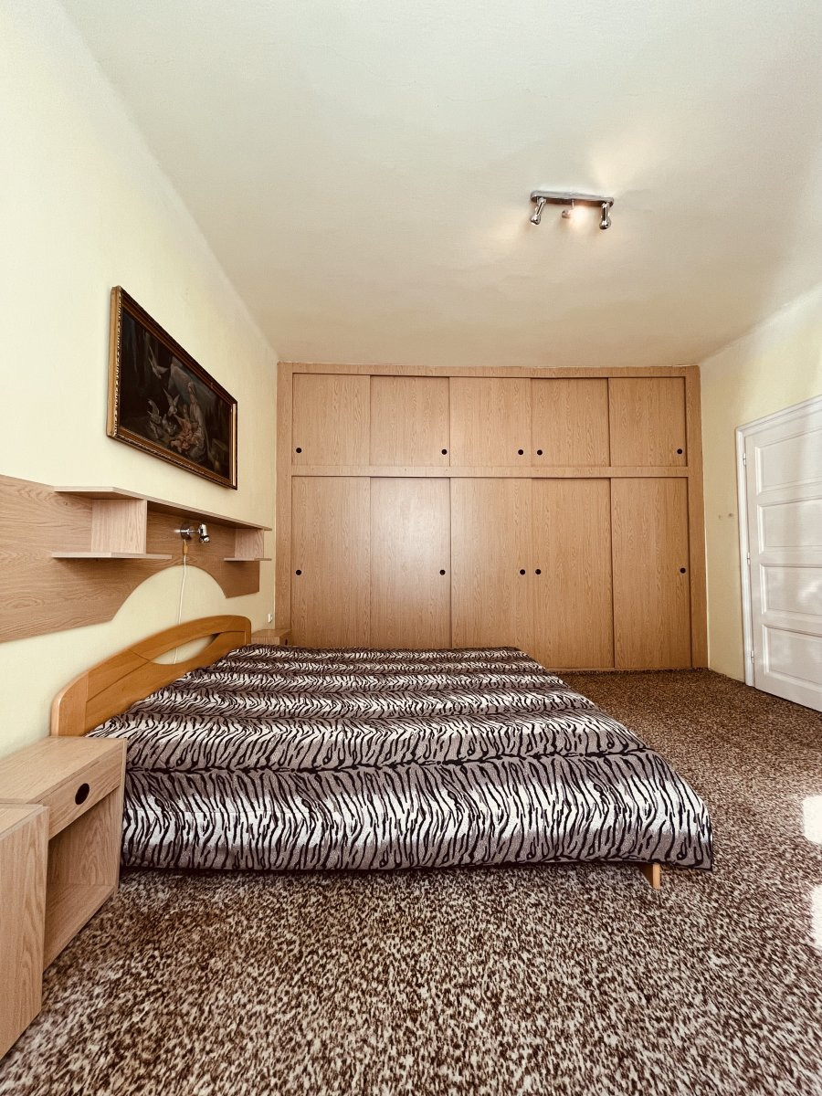 V jednom z velkých neprůchozích pokojů najdeme kompletně vybavenou ložnici s vestavěnými šatními skříněmi a kompletní manželskou postelí.