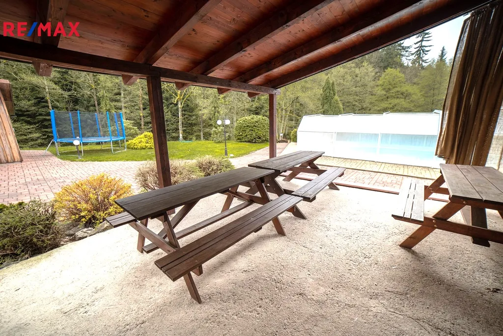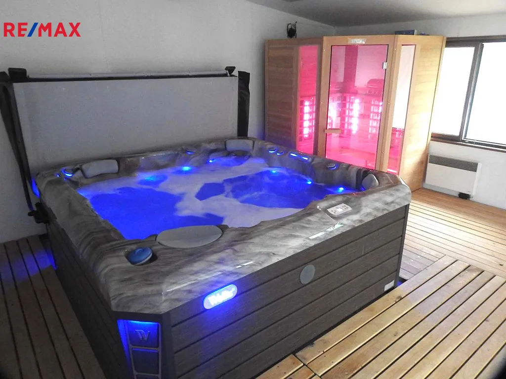 K nemovitosti dále patří krytý osvětlený venkovní bazén se slanou vodou 5x10m s protiproudem (zastřešení 8x14 m). Profesionální whirlpoolka pro 5 osob s LED osvětlením – světelná terapie, ozvučená, s vodopádem vás uhrane, najdete v ní absolutní relax.