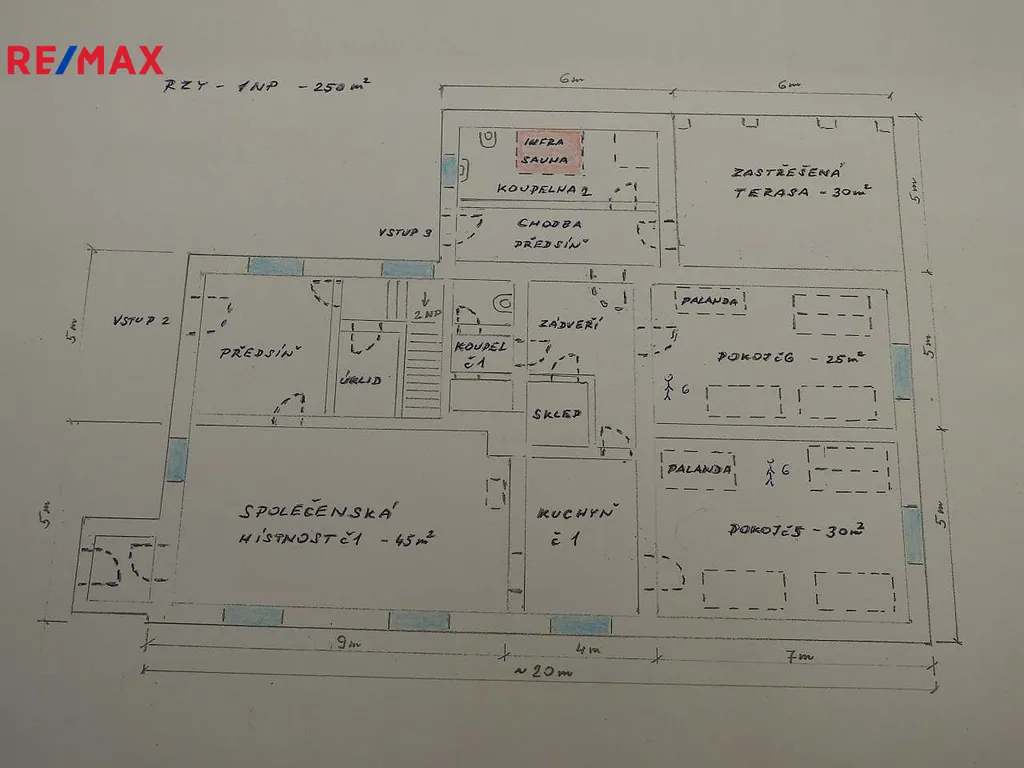 Zrekonstruované sociální zařízení je v obou podlažích, 2x v 1.NP a 1x v 2.NP. Dále se zde nacházejí dvě infrasauny.