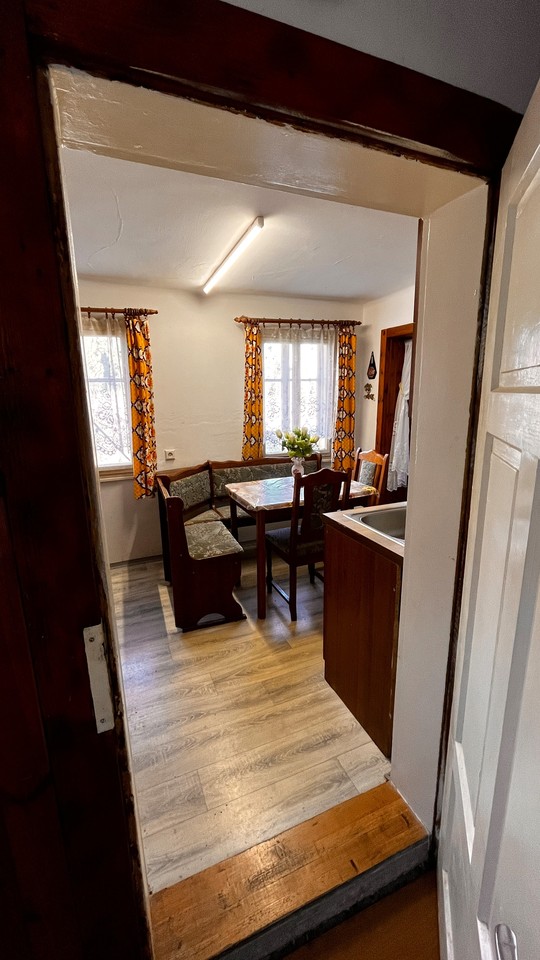 Nyní k samotnému domu. Nabízí přesně co většina z nás hledá. Při procházení jednotlivých částí domu cítíte kouzlo minulosti, naše předky a máte pocit jako, když se vracíte do dětství. V přízemí je dominantou velký obývací pokoj ( cca 28 m2 ) ze kterého jsou krásné výhledy do zahrady a na již zmíněný kostel sv. Václava. Vedle obývacího pokoje je útulná kuchyňka ( cca 9m2 ). Z chodby přízemí se dostanete do sklepa a nebo jeho patra. Tam vás čekají další tři útulné pokoje kde můžete spočinout. Pokud máte nepotřebné věci můžete je uskladnit na půdě. V přední části domu máme koupenu s toaletou.
