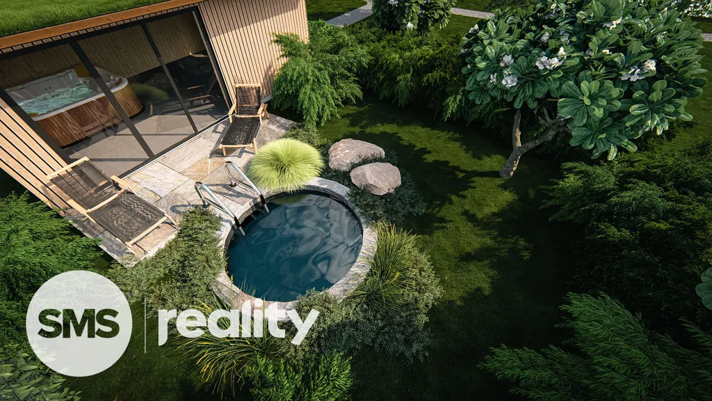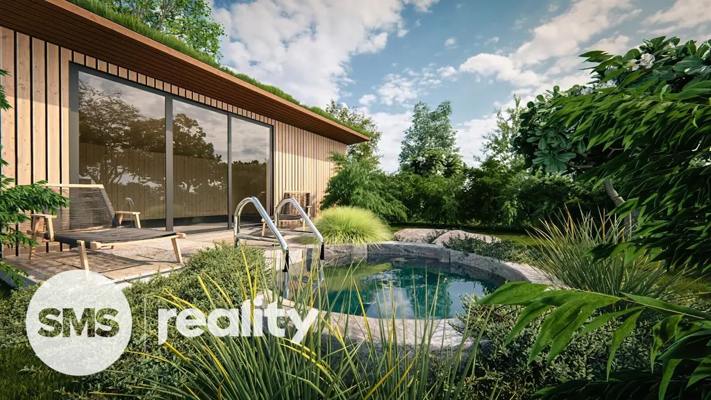 Wellness centrum: Relaxační jednopodlažní objekt s vířivkou, zahradní sprchou a odpočívárnou. Zastavěná plocha 37 m².
