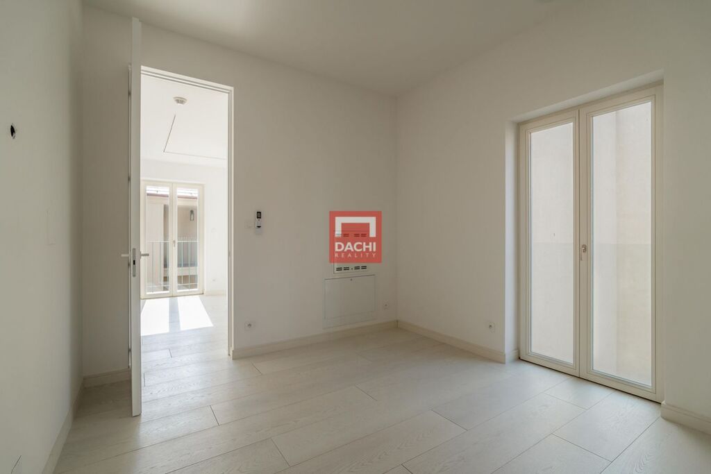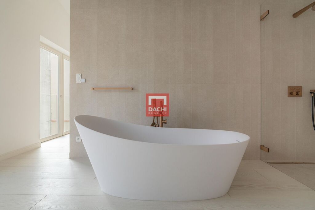 Penthouse je vybaven špičkovými prvky: koupelny Gessi, osvětlení Modular, dřevěné podlahy Foglie DOro z dílny Valen and Masar, prémiová keramika Porcelanosa. Celkový dojem podtrhují bezfalcové dveře až ke stropu, které přirozeně navazují na výšku stropů a podtrhují nadčasovou eleganci celého prostoru.