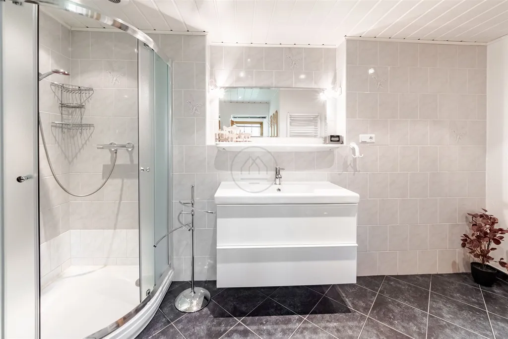 Přízemí domu také zahrnuje prádelnu, kotelnu, sklad a prostornou garáž s dílnou. Vytápění a ohřev vody zajišťuje moderní kotel s automatickým přísunem pelet ze zásobníku na 8 tun. Dále je možné alternativní vytápění dřevem v kamnech. Na pozemku je také vrt na vodu a kopaná studna. Kanalizace je řešena 3komorovým betonovým septikem o kapacitě 10m3.