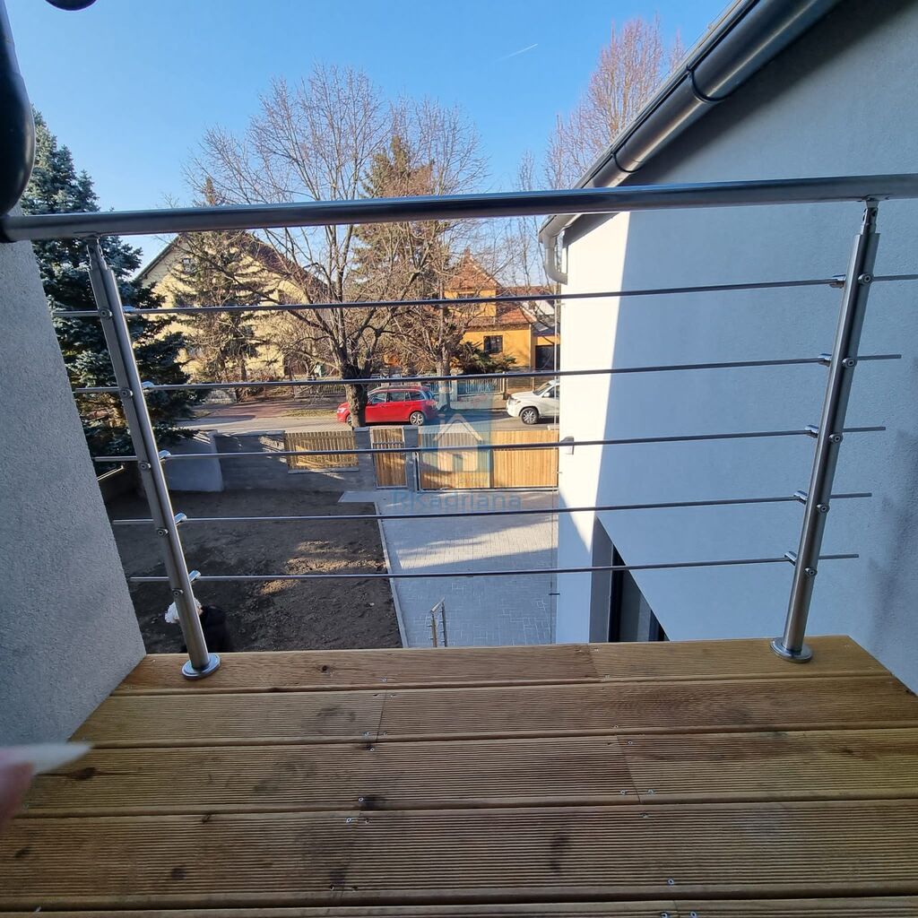 Byt se nachází ve dvoupodlažní cihlové budově a je umístěn v prvním a druhém patře. Disponuje velkou terasou a balkónem.