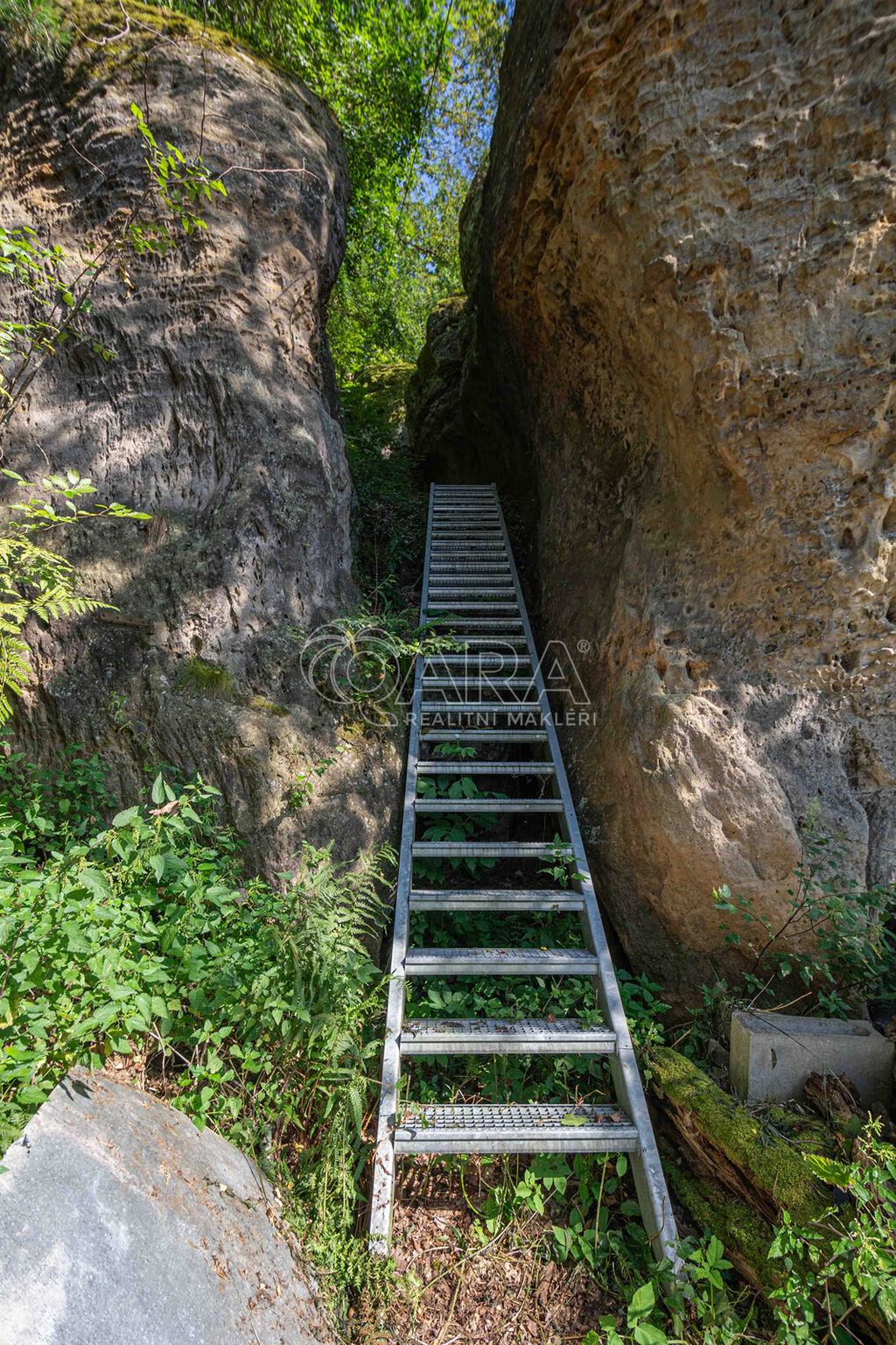 Dispozice: vstupní chodba ze které je vstup do skalního sklepa, koupelna se sprchovým koutem a WC zapuštěným ve skále, obývací pokoj s krbem, kuchyně taktéž zapuštěná do skály, pokoj v suterénu a otevřené horní patro, sloužící jako ložnice. Venku technická místnost s motorovým proudem, dílna a další sklep, vše zapuštěné ve skále s vlastním vchodem.