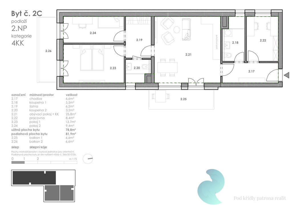 Nabízený byt č. A-2C o dispozici 4+kk, výměře 78,8 m2 a dvěma balkony 6,6 m2 a 6,6 m2, se nachází v prvním patře budovy A. Disponuje vstupní chodbou, obývacím pokojem s kuchyňským koutem, koupelnou, toaletou, šatnou a třemi neprůchozími pokoji.