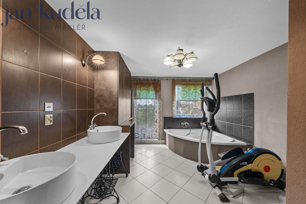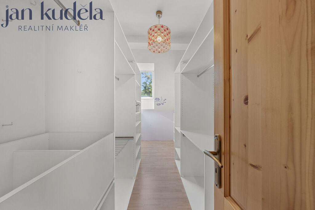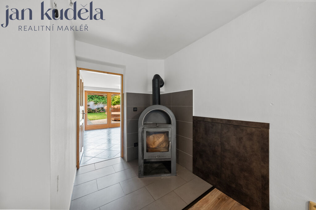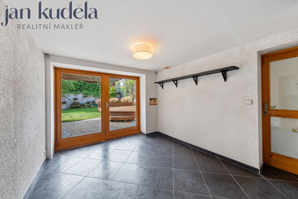 V přízemí se nachází zádveří, ze kterého vstupujete do prostorného obývacího pokoje s krbem. Odtud je přístup do zimní zahrady, ze které se dostanete přímo na zahradu nebo do dílny a garáže. Z obývacího pokoje se dále vchází do kuchyně s jídelnou, odkud je opět vstup na zahradu. V přízemí se nachází také první koupelna. Po dřevěném schodišti se dostanete do patra, kde se nachází tři ložnice, šatna, pracovna a druhá koupelna.  Z jedné z ložnic a také z horní koupelny je přímý vstup na nedokončenou terasu, která čeká na nové majitele a jejich představy o tom, jak prostor dále využít – ať už jako místo k relaxaci či pro další prostor pro zeleň.