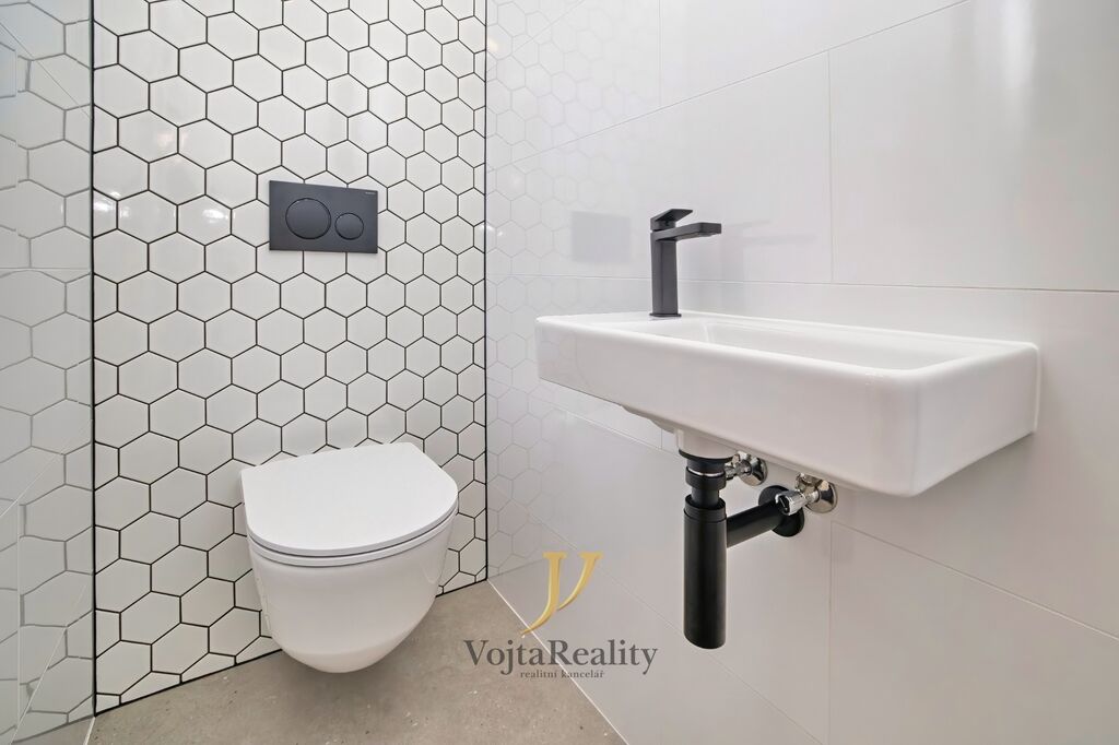 V obytných místnostech jsou položeny dubové podlahy s podlahovým vytápěním po celém domě. Okna jsou z hliníkových profilů a s trojskly, která zajišťují kvalitní odhlučnění i izolaci, velkým benefitem jsou kvalitní venkovní žaluzie, které jsou hlídány ve vztahu k rychlosti větru a mohou být ovládány i na dálku. Raritou a ozdobou domu jsou 3 střešní světlíky, díky kterým je krásný a netradiční výhled v ložnici, chodbě a koupelně. Dveře značky Sapeli se spolehlivým kováním jsou designové a bezfalcové. Koupelna je vybavena umyvadlem, sprchovým koutem a závěsnou toaletou. Další samostatná toaleta je umístěna v chodbě. Výrazným prvkem moderní architektury jsou pohledové betonové stropy v celém domě. Kuchyň je připravena pro zbudování kuchyňské linky na míru s možností moderního ostrůvku s vařením. Do zahrady ústí malé dřevěné terasy z kuchyně a ložnice, velká terasa z obývacího pokoje, která se navíc pyšní bioklimatickou pergolou s polohovatelnými lamelami, jejichž sklon můžete libovolně ovládat třeba i smartphonem. Dřevo v exteriéru je sibiřský modřín. Základem kvalitní zahrady je vrstva černozemě, vzrostlý trávník a úprava terénu díky opěrné zdi z monolitického betonu. Zahrada je stejně jako dům nachystána na naplnění snů majitele.