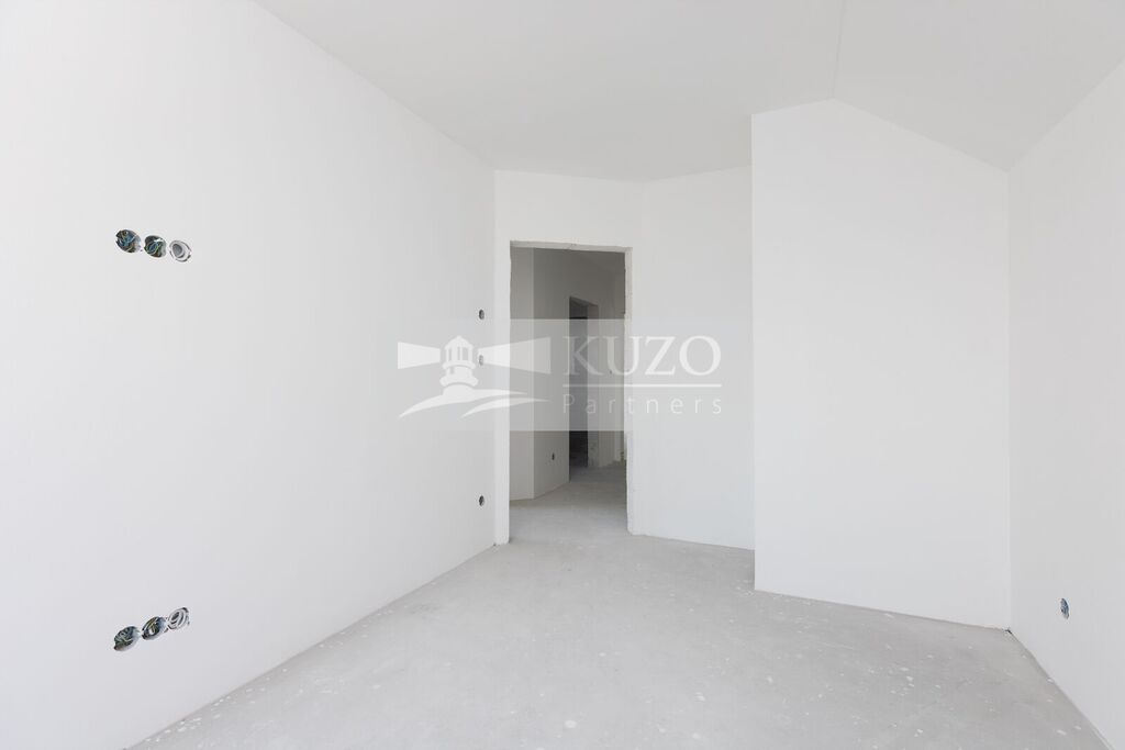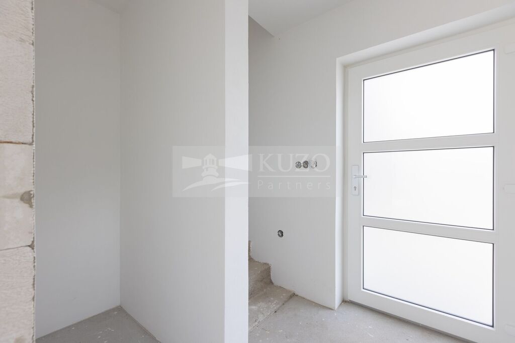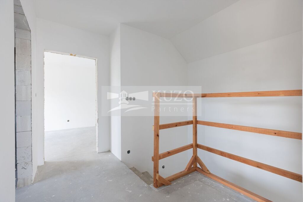 Podlahy v přízemí pokrývá praktická dlažba. V patře je podlaha z vinylové krytiny v barvě světlého dubu, která je odolná a snadná na údržbu. Interiérové dveře a obložky jsou provedeny v bílé barvě, což podtrhuje čistý a moderní vzhled interiéru. Kuchyň je vybavená kuchyňskou linkou s vestavnými spotřebiči.