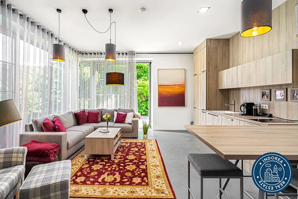 Všechny hlavní interiérové prostory plynule přecházejí do venkovních teras. Správná orientace vily zajišťuje dostatek přirozeného světla po celý den, zatímco pečlivě udržovaná zahrada vytváří oázu klidu s ovocnými stromy, vlastním lesoparkem a prostorem pro aktivní odpočinek v podobě tenisového kurtu a krytého posezení s ohništěm.