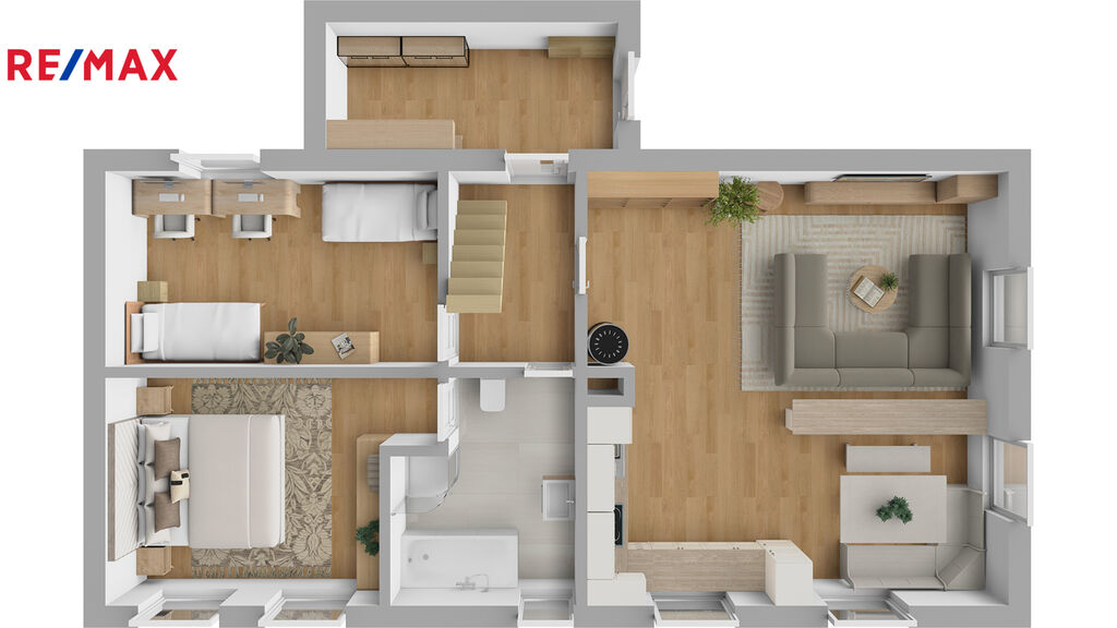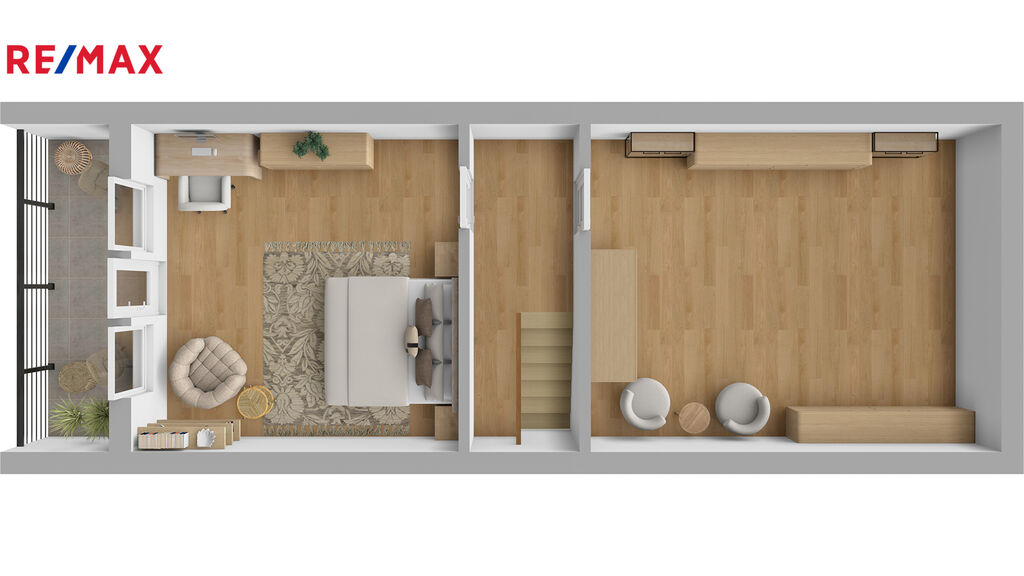 2. NP (podkroví): chodbička, menší pokoj, lodžie, přístup na prostornou půdu