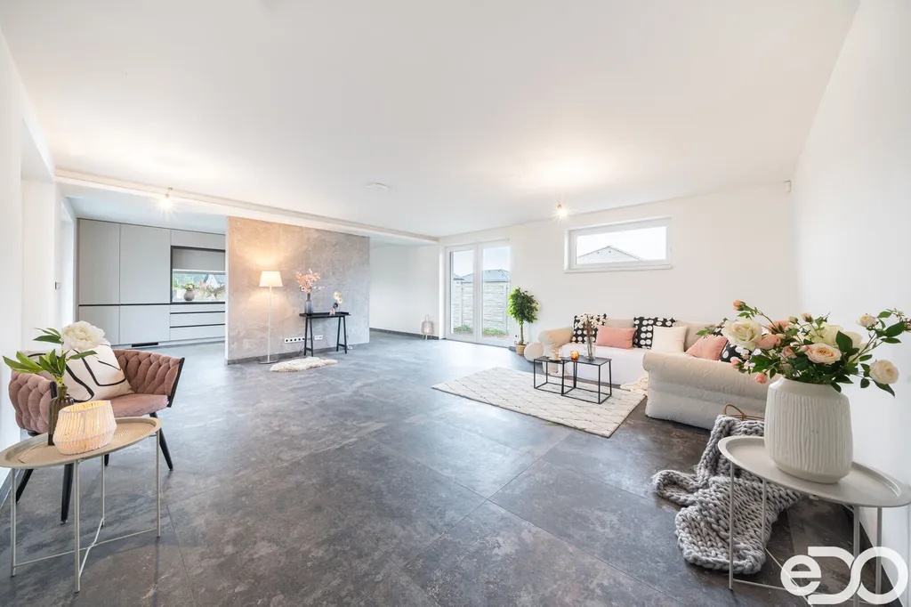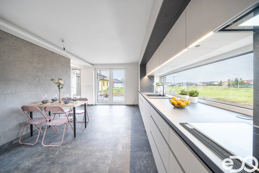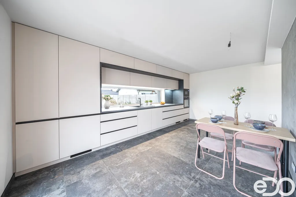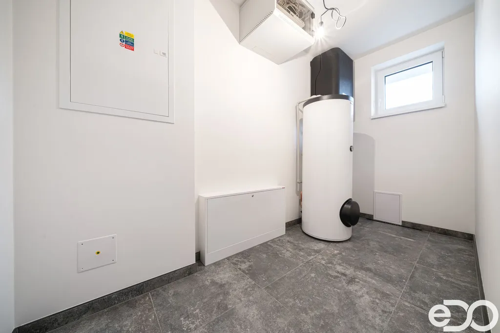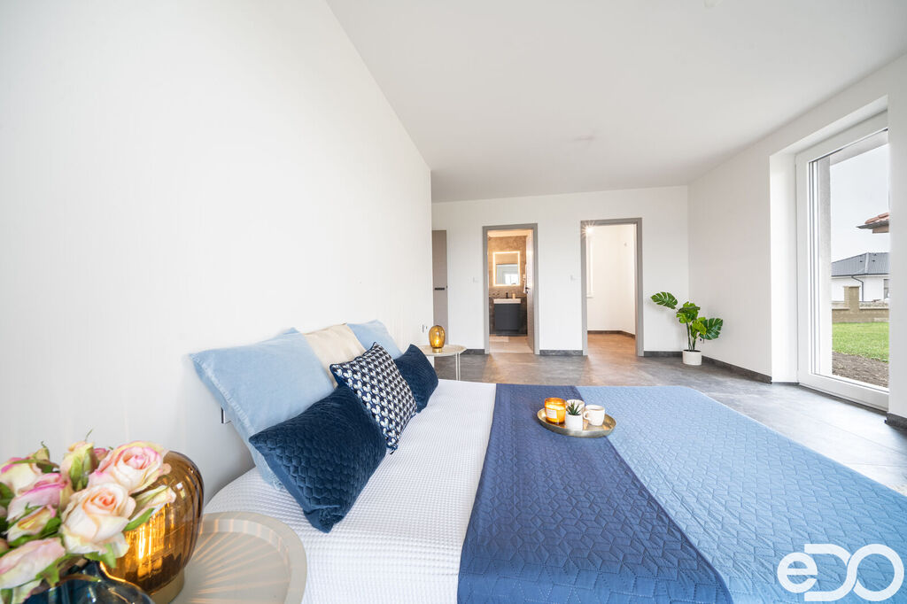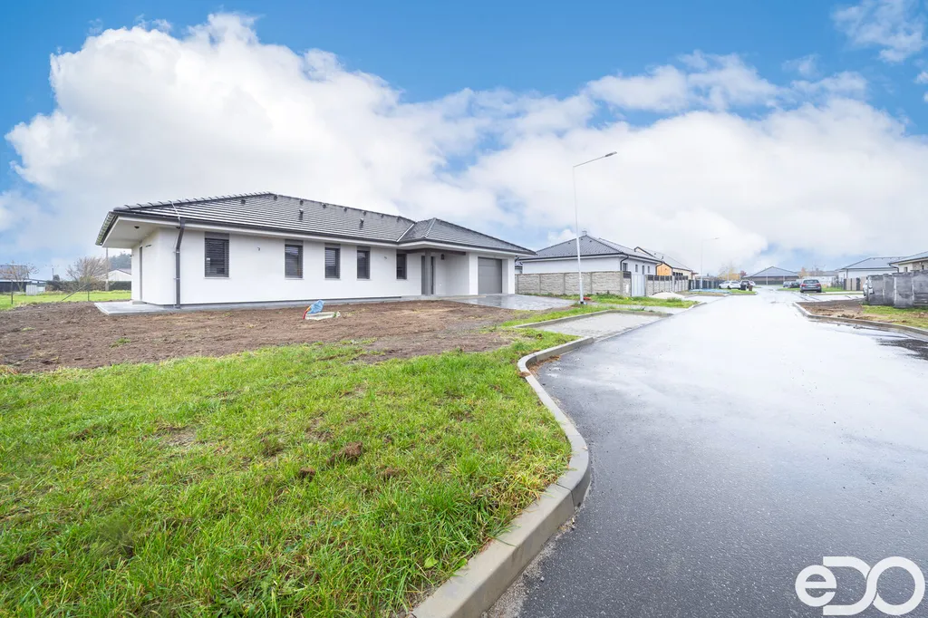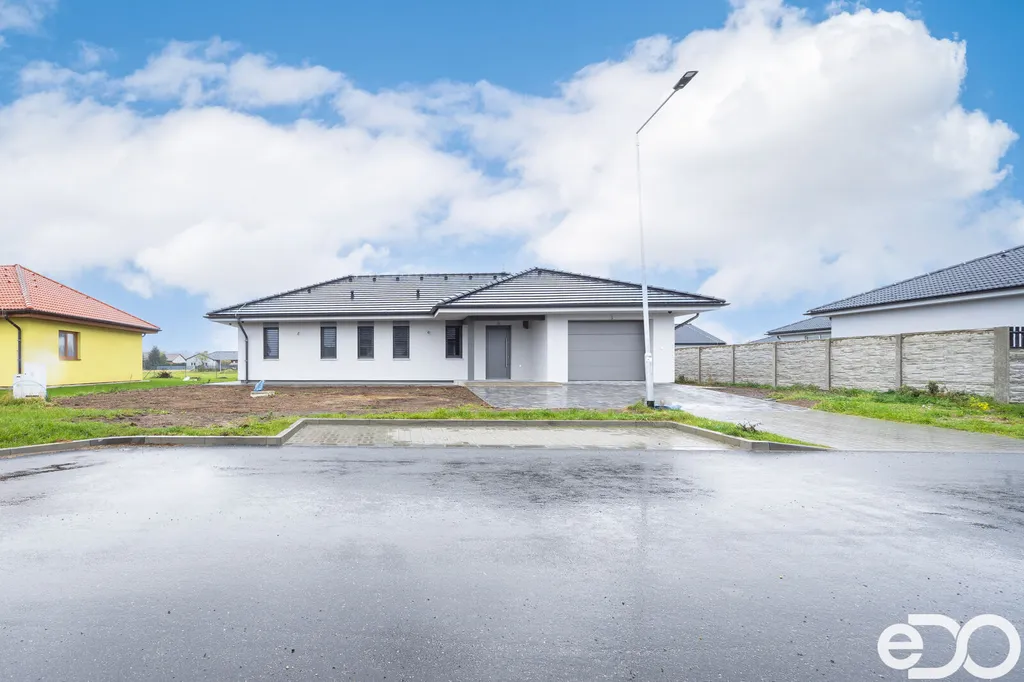 Skvělá dispozice domu nabízí prostorný obývací pokoj s kuchyňským a jídelním koutem, kde se nachází na míru vyhotovená designová kuchyňská linka včetně špičkových spotřebičů francouzské značky DE DIETRICH: trouba, mikrovlnná trouba, varná deska, integrovaná digestoř v horní skříňce, plně integrovaná myčka a lednice s mrazákem. Ze strany kuchyně i obývacího pokoje je aplikována betonová stěrka a stěna je připravena na umístění jídelního stolu. Z velkolepého obývacího pokoje je vstup na venkovní terasu, kde si budete v klidu a pohodě užívat slunných dnů. V domě se dále nachází samostatná část zahrnující ložnici se šatnou a menší koupelnou se sprchovým koutem a toaletou, dva dětské pokoje, velká koupelna s vanou a toaletou a další místnost využívaná jako šatna nebo prádelna. Dostatečné prosvětlení ložnice a dětských pokojů zajišťují dvoukřídlová francouzská okna. Okna a dveře jsou plastová, zasklená izolačním trojsklem. Vytápění je zajištěno tepelným čerpadlem, v celém domě je teplovodní podlahové topení. Velkou přidanou hodnotou tohoto domu jsou venkovní žaluzie dělané na míru, které využijete ve dne i v noci a které chrání vaše soukromí a vytváří příjemné prostředí. Garážová vrata mají inteligentní pohon ovládaný mobilní SmartHome aplikací SOMweb. Dům je vybaven zabezpečovacím a kamerovým systémem JABLOTRON. Přívod pitné vody vodovodní přípojkou, kanalizační přípojka tlaková a dešťová akumulační jímka. Dům má valbovou střechu, s pochozím půdním prostorem. Venkovní povrch v okolí domu je řešen betonovou zámkovou dlažbou, která se nachází jak na zadní terase, tak na parkovacím stání před garáží a na chodnících kolem domu.