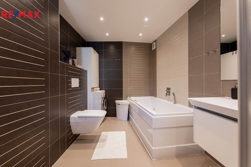 Moderní kuchyň o výměře 12,69m2 s výhledem do dvora, jsou zde zabudované spotřebiče - myčka nádobí, el, trouba, odsavač, indukční varná deska, mikrovlnná trouba, bezúchytkový systém a podsvícení linky, které by zůstávaly součástí prodeje. V koupelně 9.08m2 se nachází podlahové topení, je velmi prostorná, je zde masážní vana, sprchový kout, umyvadlo a WC.