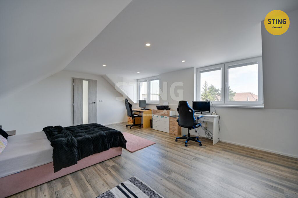 Dispoziční řešení domu: v 1 NP je předsíň, prostorná koupelna se sprchovým koutem a WC, ložnice, obývací pokoj s kuchyňským koutem zařízeným spotřebiči zn. Whirpool, technická místnost. V podkroví je k dispozici velký pokoj o výměře 30 m2 vhodný k rozdělení na 2 místnosti, druhá koupelna s vanou a samostatná šatna.