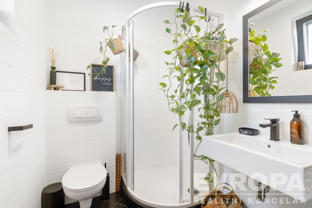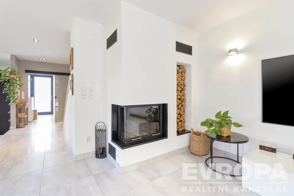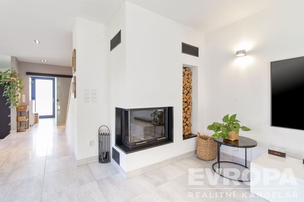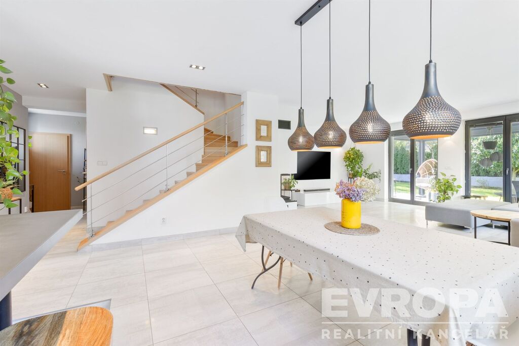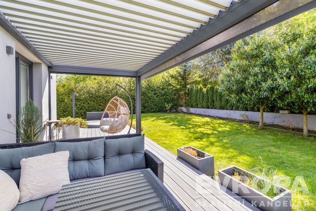 V přízemí se nachází vzdušný obytný prostor propojený s kuchyní a jídelnou, s přímým vstupem na zahradu s terasou. Ta je vybavena bioklimatickou pergolou, vířivkou, grilovacím koutem a venkovním betonovým stolem. Dále je zde samostatný pokoj, koupelna s WC a prostorné zádveří. Vstup do domu vede přes jižní terasu s krásným výhledem do okolí.