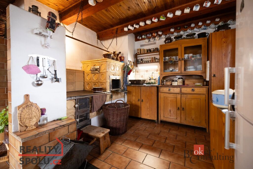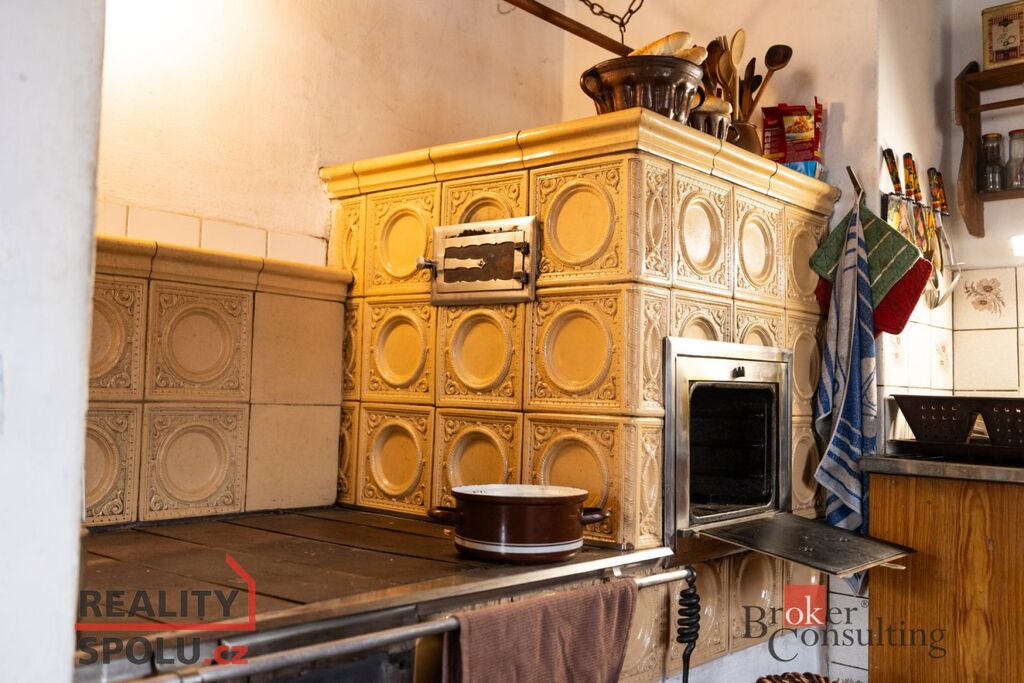 Přízemí Vás uvítá rozlehlou verandou táhnoucí se přes celou šíři domu. Ta přirozeně propojuje vstup do domu a výstup na slunnou terasu. Dispozice dále zahrnuje dvě samostatné útulné ložnice, koupelnu, toaletu a především centrální obývací pokoj, který tvoří opravdovou dominantu celé nemovitosti. Zde se setkává pohodlí s tradičním venkovským šarmem – místnost je vybavena krbovými kamny a propojena s kuchyňským i jídelním koutem. Celému prostoru vévodí nádherně zachovalá kachlová kamna, jako vystřižená z pohádky.