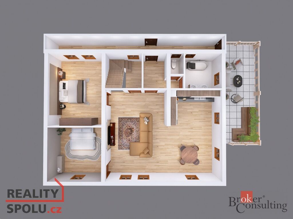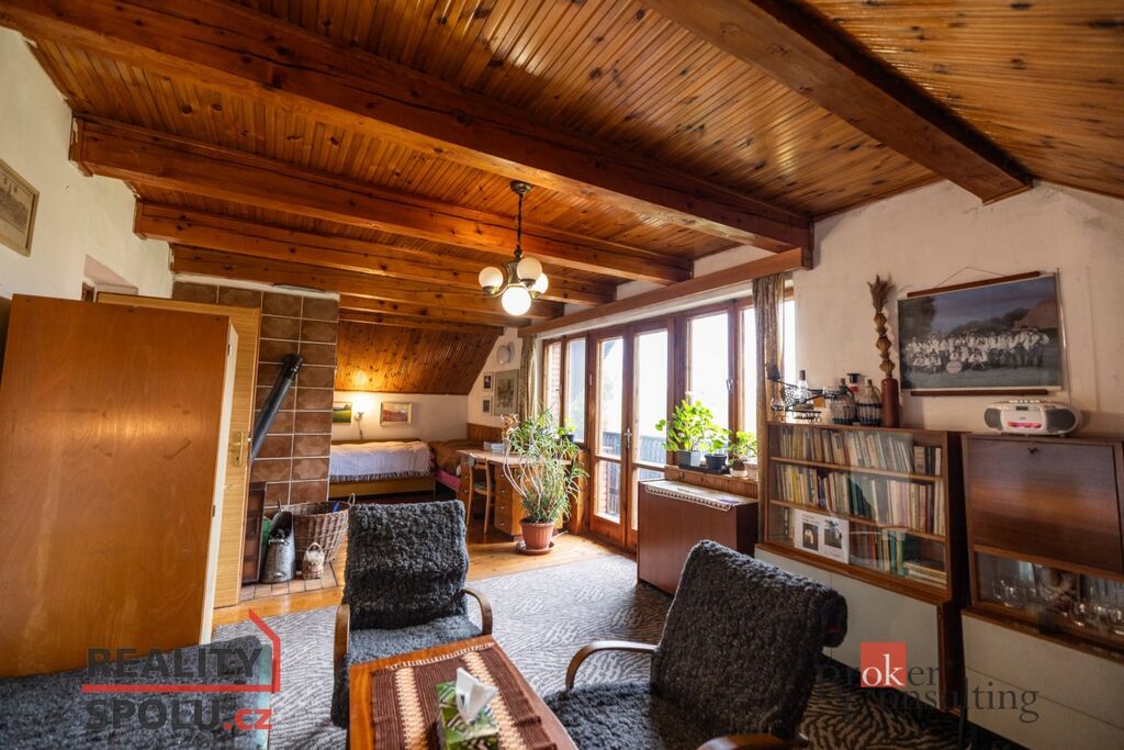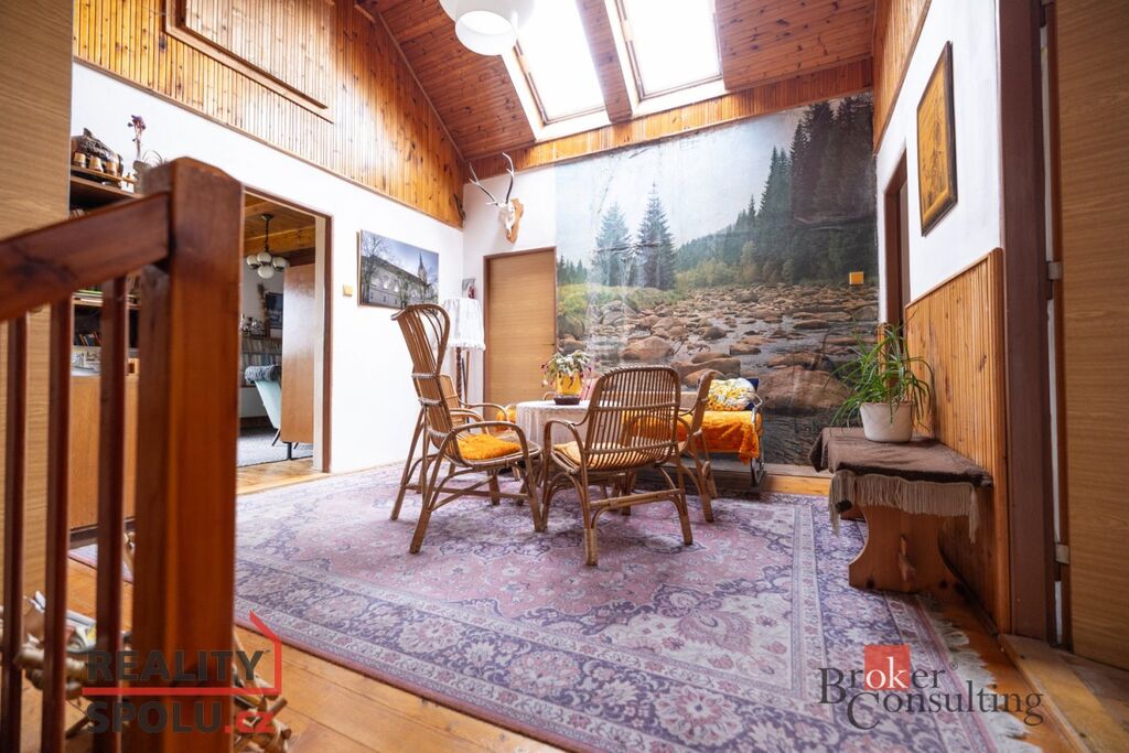 Po vyběhnutí schodiště se ocitnete v prosvětlené hale, která je přirozeným srdcem podkroví. Odtud je přístup do dvou samostatných pokojů, toalety, praktického kumbálu i do hlavního pokoje se vstupem na balkon. Právě tento pokoj nabízí úchvatný přímý výhled na hrad Kašperk a je jako stvořený pro kreativní duše – ideální jako ateliér, pracovnu či relaxační zónu. Ticho, výhled a atmosféra místa napomáhají soustředění i inspiraci.