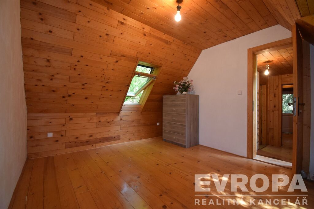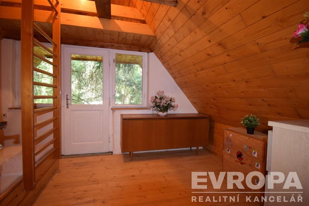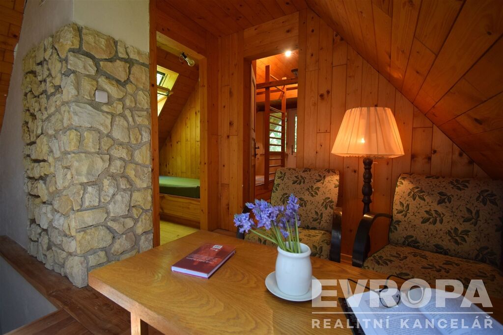 Chatová osada byla založena v šedesátých letech minulého století. Nabízená chata byla postavena v roce 1958, v roce 2001 prošla rozsáhlou rekonstrukcí spolu se zvětšením zastavěné plochy z původních 36 m2 na současných 58 m2 a vybudováním obyvatelného podkroví. Nyní má chata užitnou plochu 89 m2. V částečně zapuštěném přízemí je sklep, který slouží jako dílna, úložistě zahradního nábytku a nářadí. Ve sklepě je instalován bojler pro ohřev TUV. Ve zvýšeném přízemí je terasa, velká společenská místnost s krbem, koupelna se sprchovým koutem a WC, chodba s kuchyňským koutem a schodištěm do podkroví. V podkroví nalezneme tři ložnice a také útulný prostor pro odpočinek s knihou v ruce. Chata má vlastní vrtanou studnu, odpadní vody jsou svedeny do septiku.