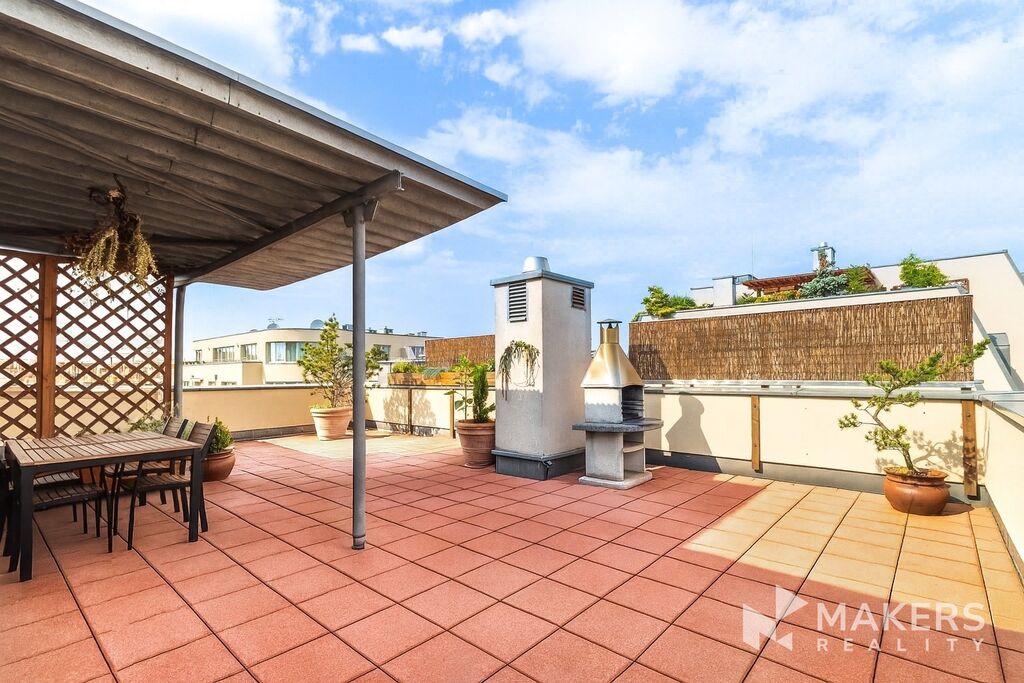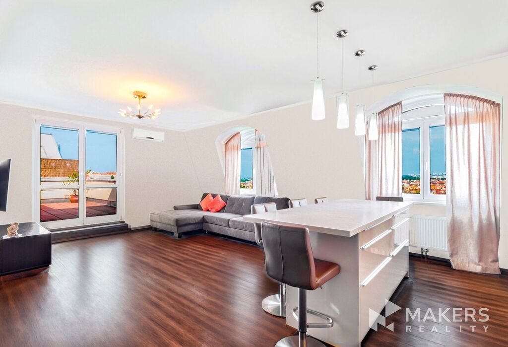 Exkluzivní bydlení s panoramatickým výhledem – byt 4+kk s velkou terasou, dvěma garážemi a bazénem v srdci Vinohrad