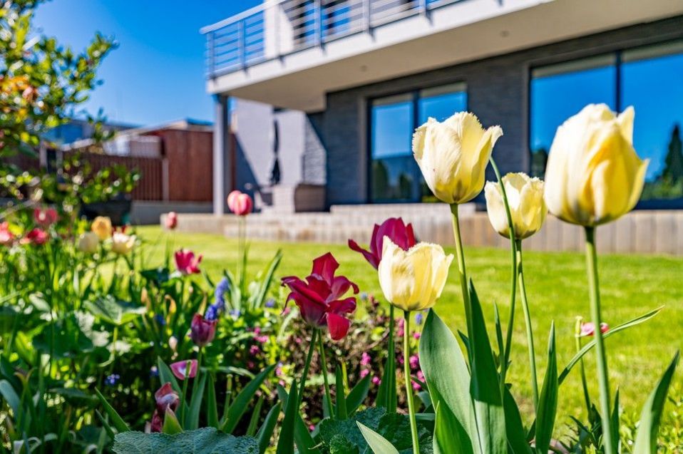 V krásné udržované zahradě jsou vzrostlé stromy, keře a záhony. Automatický zavlažovací systém Hunter čerpá vodu z vlastní studny. Další stavbou na pozemku je zahradní domek na nářadí a zahradní krb. Na východní terase v přízemí domu, orientované do hlavní části zahrady, je venkovní posezení.