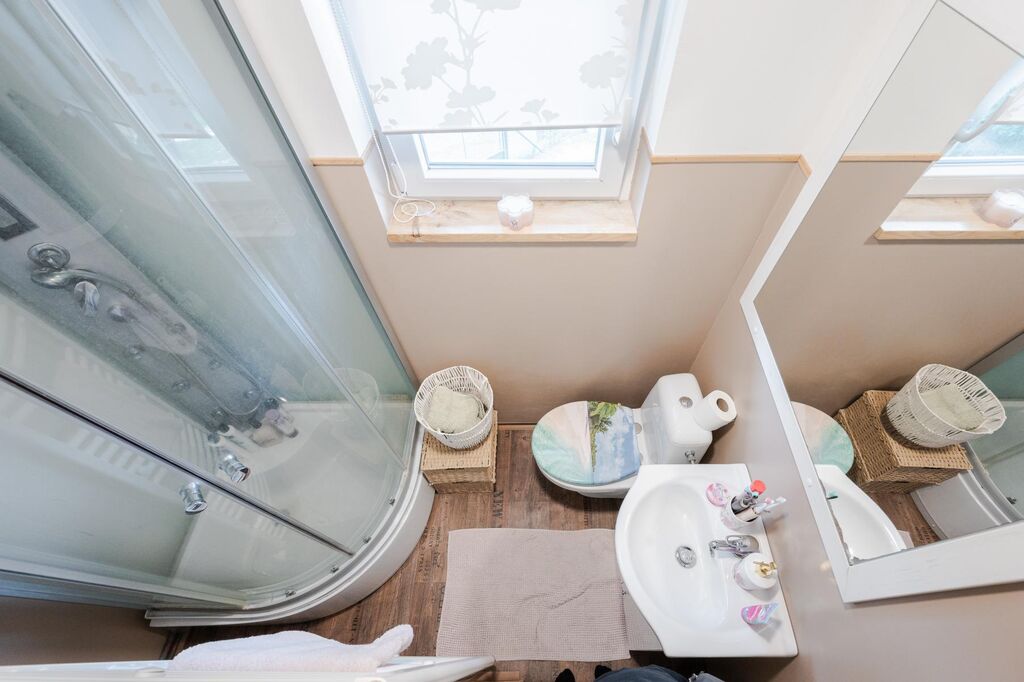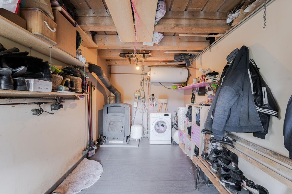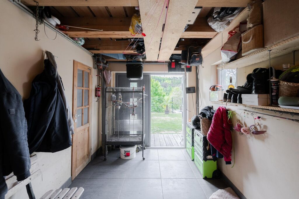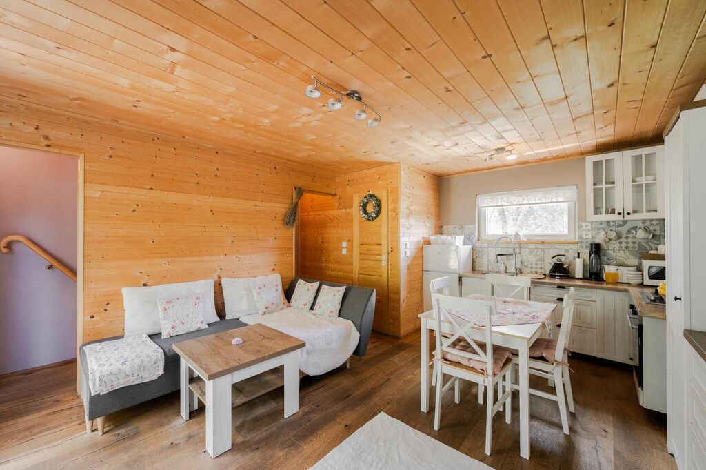 V chatě se pak nachází vstupní předsíň a menší ložnice. V úrovni přízemí je obývací pokoj s plně vybavenou kuchyňskou linkou a koupelnou se sprchovým koutem a WC. Z obývacího pokoje je vstup francouzským oknem na terasu (13,75m) spojenou se zahradou. V podkroví je vytvořen prostorný dětský pokoj, který lze ponechat otevřený nebo rozdělit na 2 ložnice. Schody dřevěné. Prostorná technická místnost/garáž se nachází v suterénu, kde je umístěn kotel na pevná paliva a vodárna. Na zahradě se nachází skleník a příjemné posezení na terase.