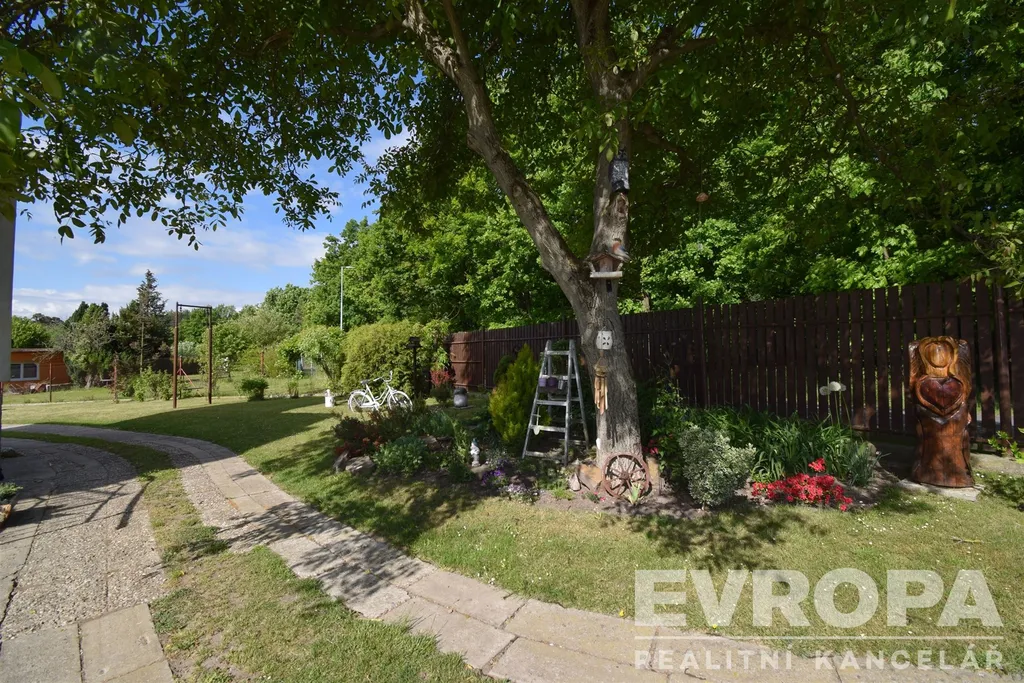 Zahrada o výměře 1.073 m2 poskytuje nejen dostatečný prostor pro relaxaci a zasloužené chvíle odpočinku, ale nabízí také možnost vlastní seberealizace při vytváření a modelování zahrady a okrasných záhonů. Na pozemku je studna. Pro zahradní techniku, nářadí a nábytek byl postaven prostorný plechový sklad se dvěma vraty. Ve skladu je zavedena elektřina. K západní straně domu je přistavěna zastřešená pergola.