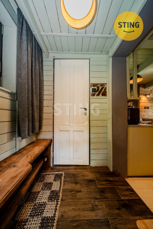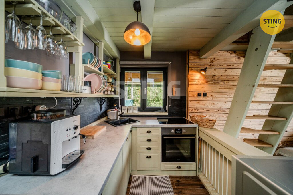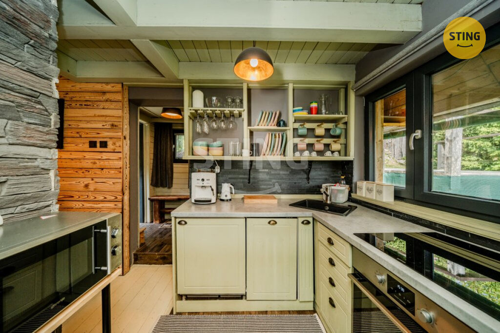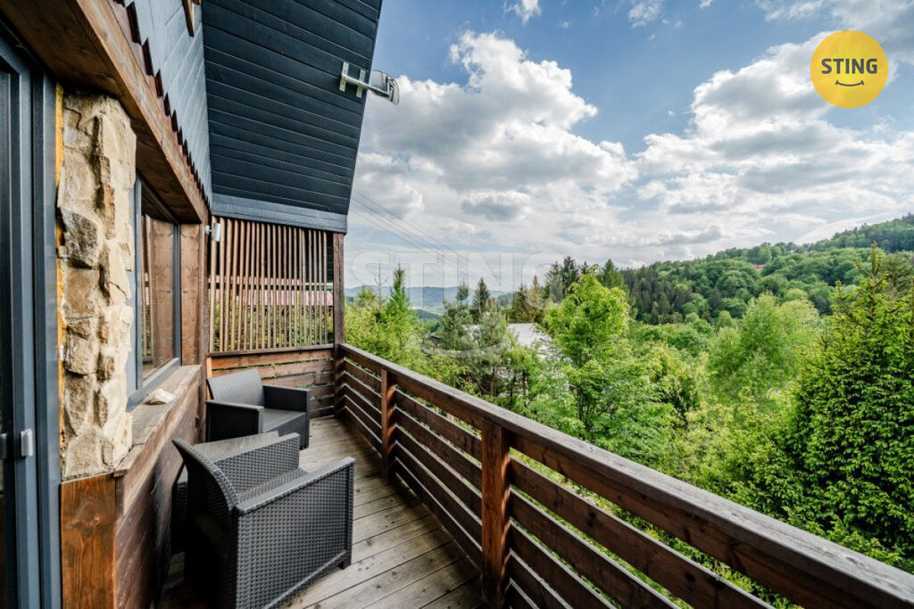 Za vstupem do chaty naleznete samostatnou toaletu s umyvadlem. U kuchyňského koutu, který je vybavený vestavěnou myčkou na nádobí, horkovzdušnou troubou s indukční deskou, se nachází jídelní prostor. Kuchyně navazuje na obývací pokoj s krbovými kamny. Z balkónu s možností posezení Vás uchvátí krásný výhled na horu Soláň.
