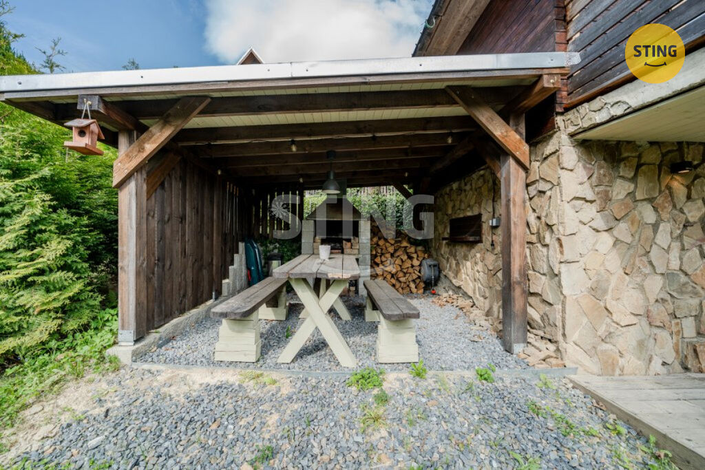 Vedle chaty je zastřešená pergola pro pohodlné posezení a grilování.