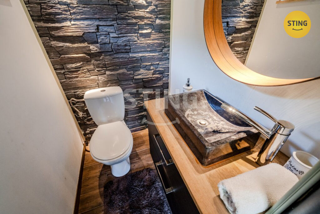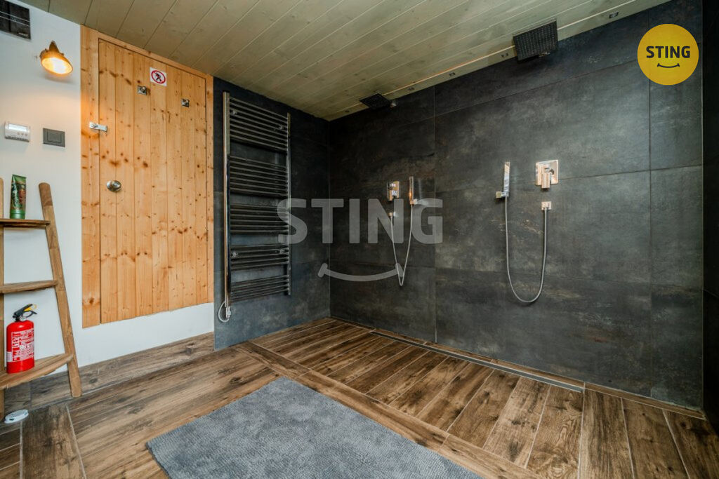 V suterénu chaty, který je přístupný schodištěm z obývacího pokoje nebo samostatným venkovním vchodem, je umístěna koupelna se dvěma moderními sprchami a infrasaunou.