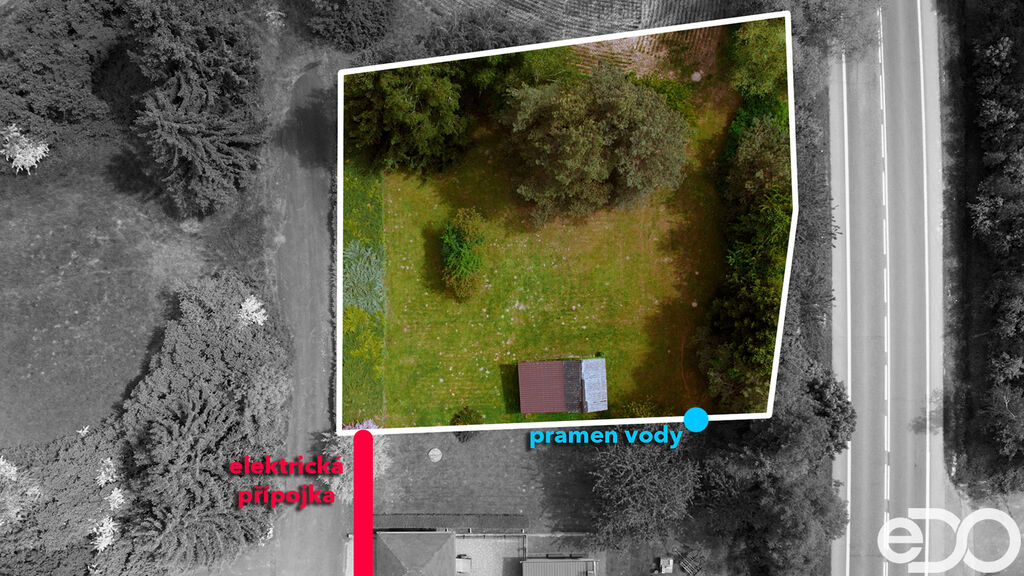Na hranici pozemku se nachází nalezený pramen vody. Elektrická přípojka je přibližně 22 metrů od hranice pozemku. Odpad je nutné řešit individuálně (např. domovní ČOV nebo jímkou), dle požadavků úřadů. Internet je řešen vzduchem.