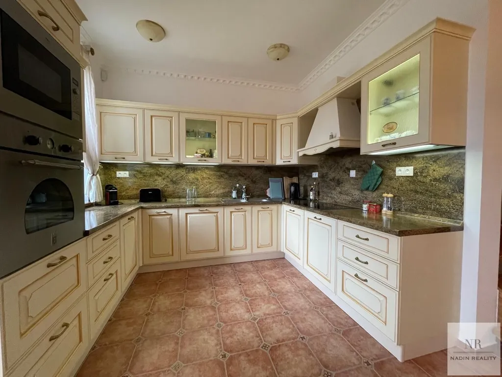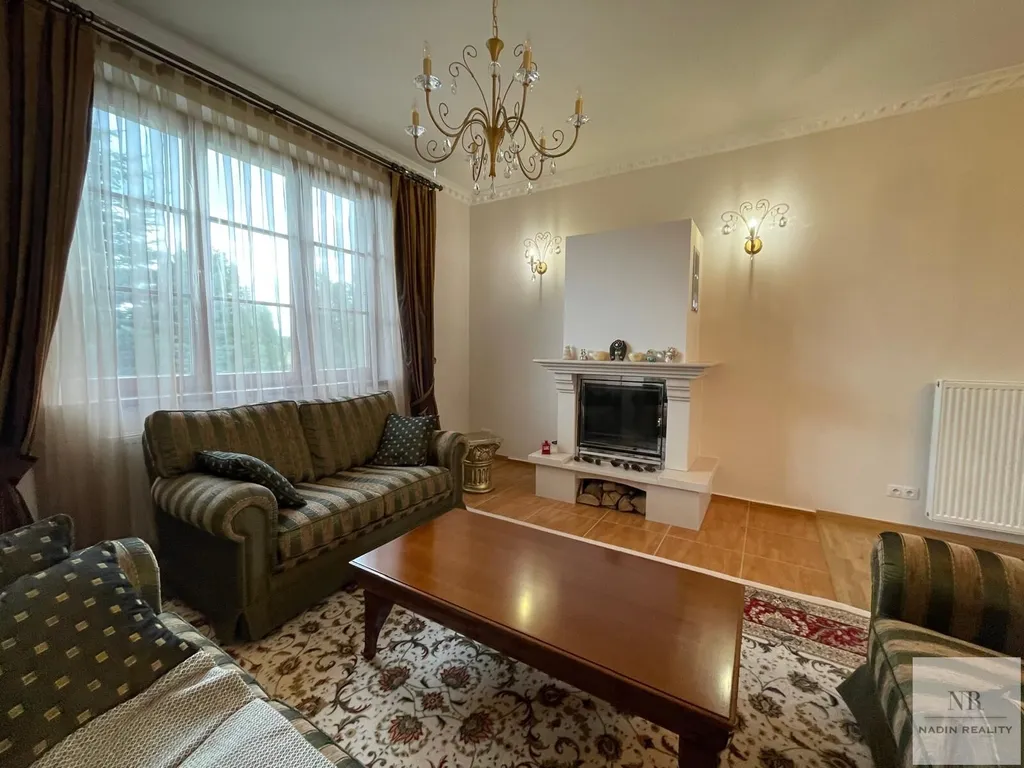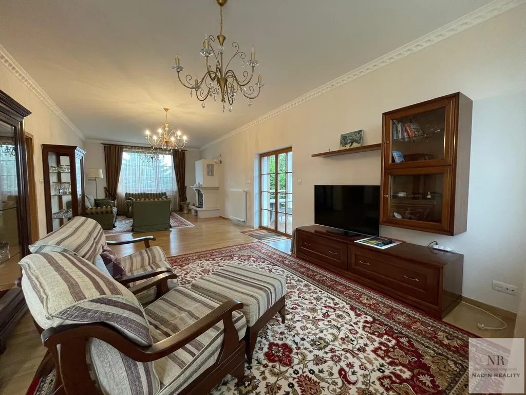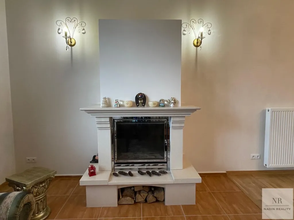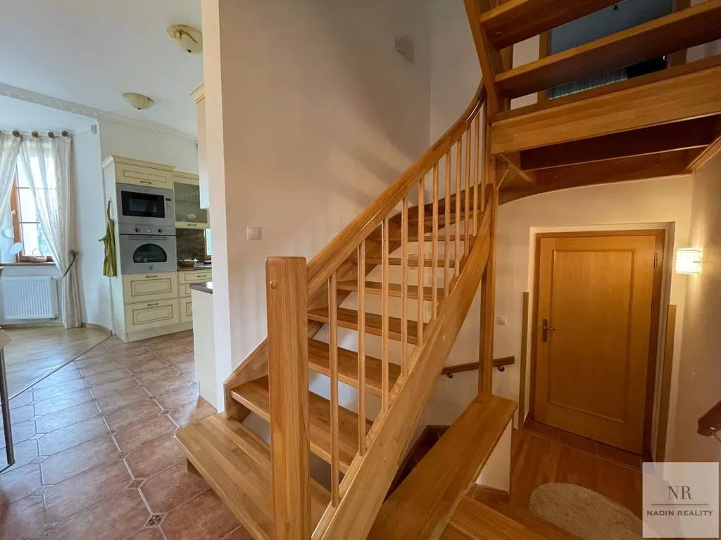Interiér domu se skládá z prostorného obývacího pokoje s krbem, jídelnou a moderně vybaveným kuchyňským koutem s vestavěnými spotřebiči. Vstupní chodba je vybavena šatnou a sociálním zařízením. V suterénu se nachází šatna, prádelna, sklad, bar, vířivka, sauna a sprcha, což umožňuje maximální využití tohoto prostoru.