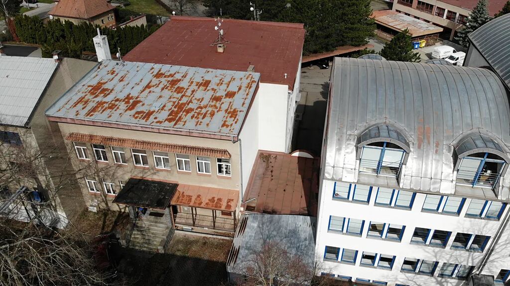 2) Stará budova o rozloze 8,5 m x 16 m má hlavní vchod z areálu Chotěbořských strojíren. Svažitá střecha je plechová pozinkovaná. Budova má taktéž dvě nadzemní podlaží a je podsklepená. Obě budovy jsou v prvním patře průchozí společnou chodbou. Přízemí má vlastní WC a umyvadlo s teplou vodou. V prvním patře je možno využívat toalety v nové budově.