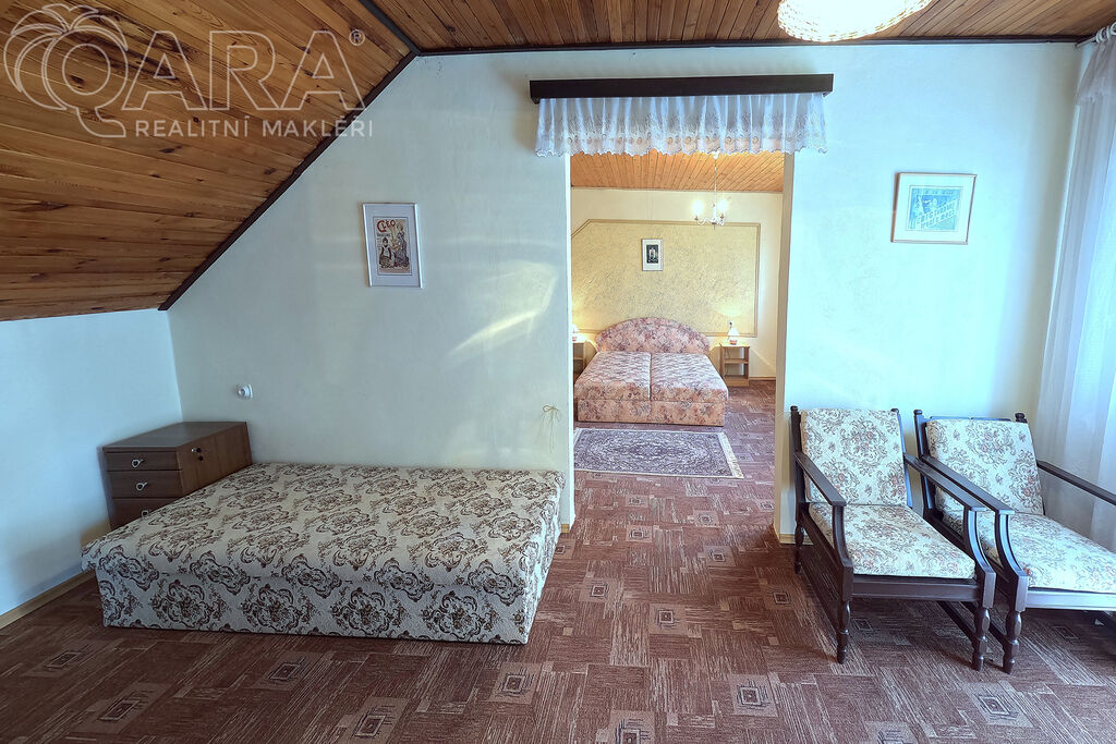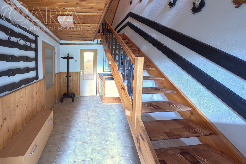 V patře jsou pak dvě průchozí ložnice a jako bonus velký balkón s výhledem na zalesněný protilehlý kopec.