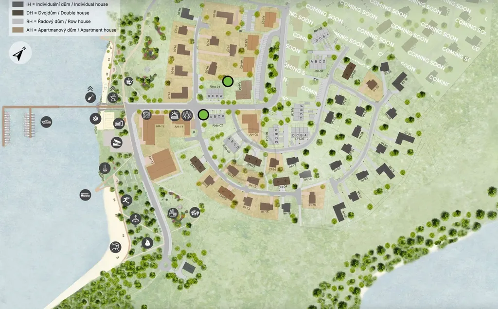 Jedná se o výjimečný a atraktivní resort, který cílí na všechny skupiny a má potenciál být nejlepším místem pro trávení volného času na Lipně. K dispozici bude recepce, beach bar a další služby. V areálu je také písčitá přírodní pláž, přístaviště pro 39 lodí, dětské hřiště a místa pro další aktivity jako pétanque, disk golf aj. Připraven je také rental a facility managment, který se stará o správu a údržbu resortu, odklízení sněhu, sekání trávy aj. Na prodej jsou i další pozemky, apartmány a řadové domy.