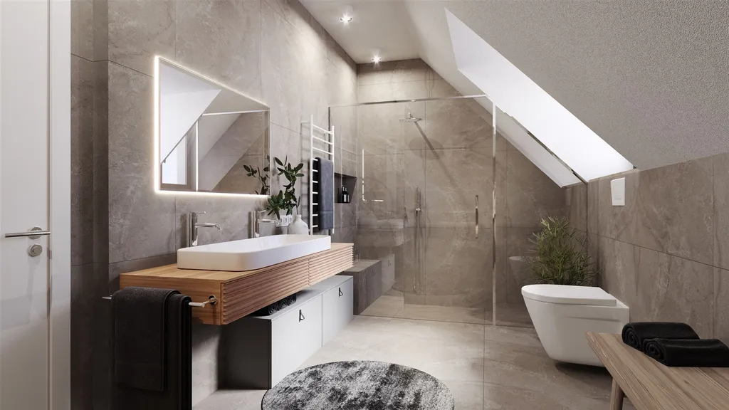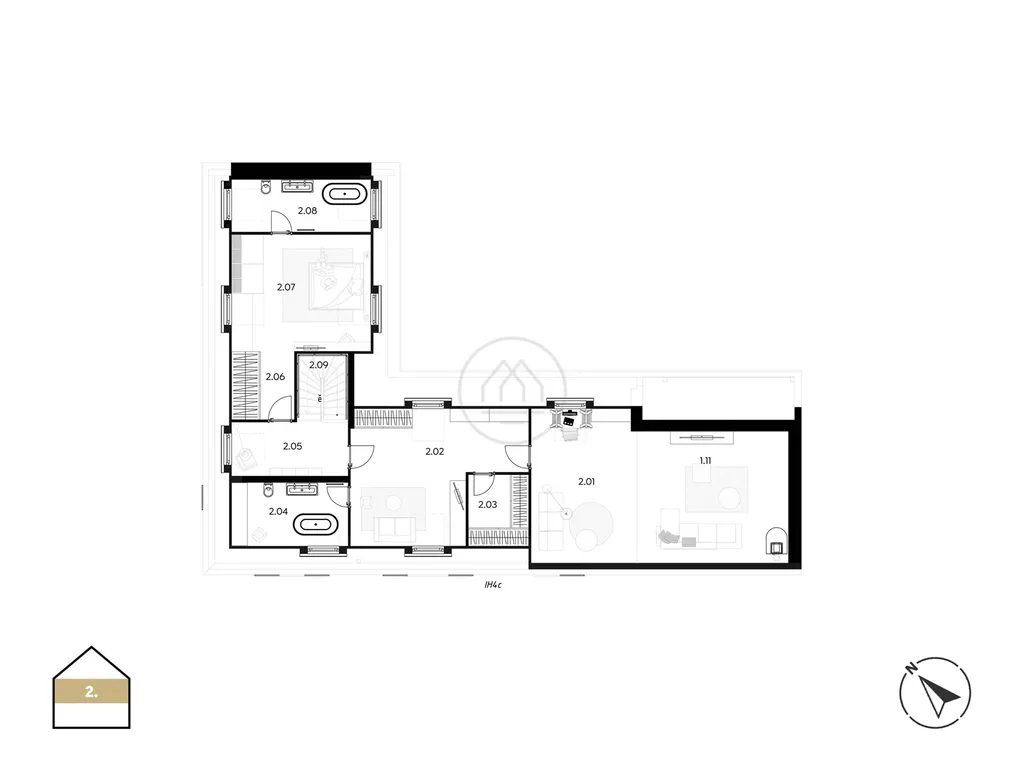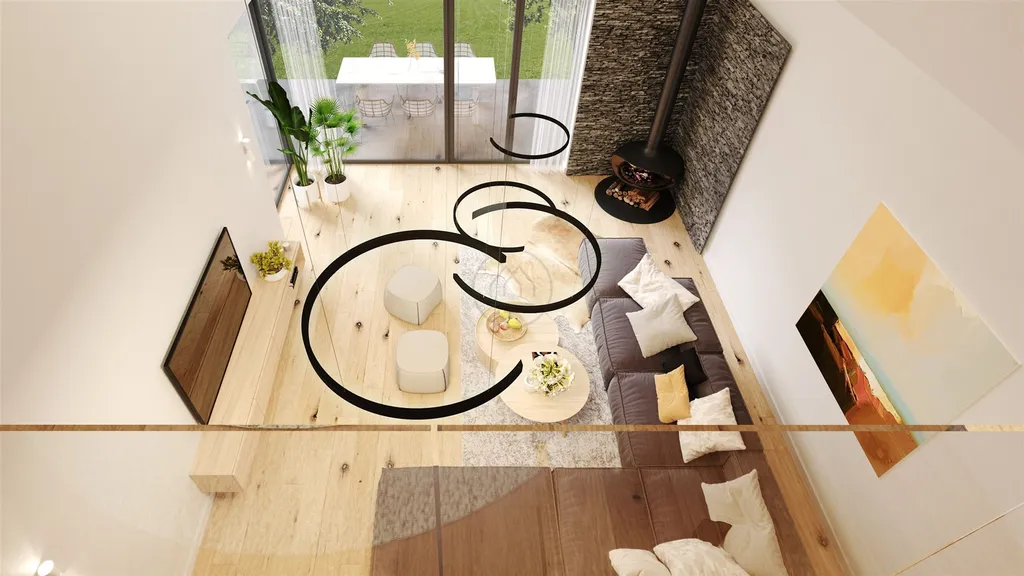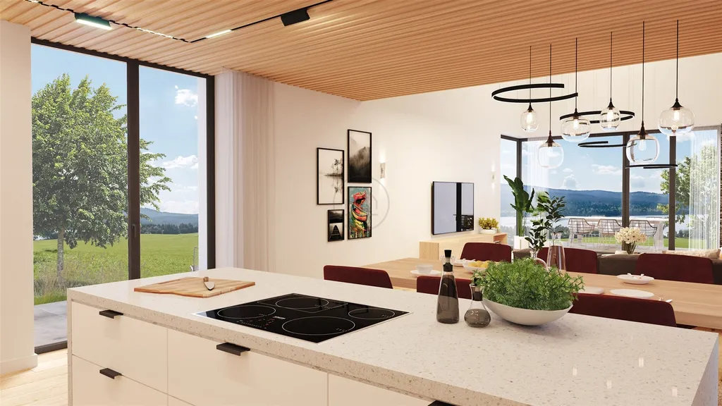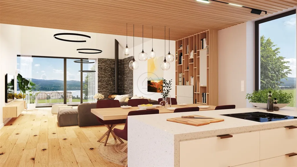 Navržené přízemí domu uvítá halou, ze které je přístupná koupelna, dva pokoje a privátní wellness se sociálním zázemím. Chodba vede dále do velkolepé obývací části spojené s kuchyní a vstupem na krásnou terasu s unikátním výhledem na vodní hladinu. Celý interiér navazuje na útulnou terasu s přípravou pro bazén a obrovskou soukromou zahradou obklopenou přírodou. V podkroví se nachází prosvětlená galerie a dva samostatné suites, každý s vlastní koupelnou a šatnou.