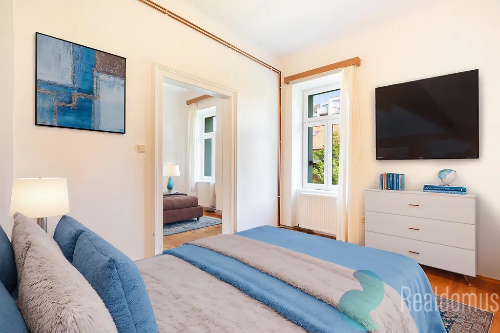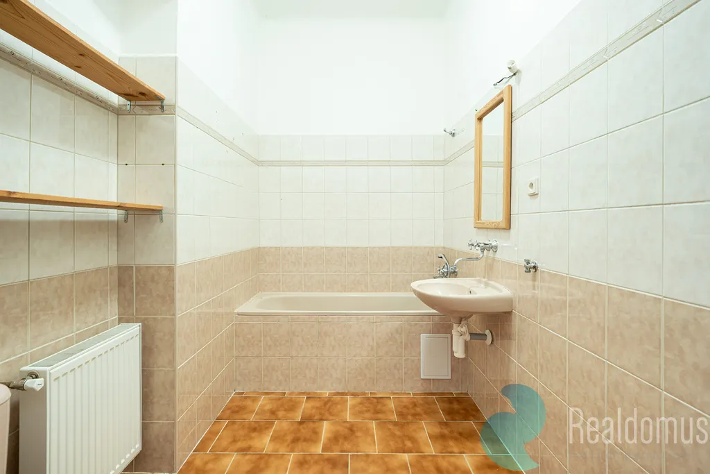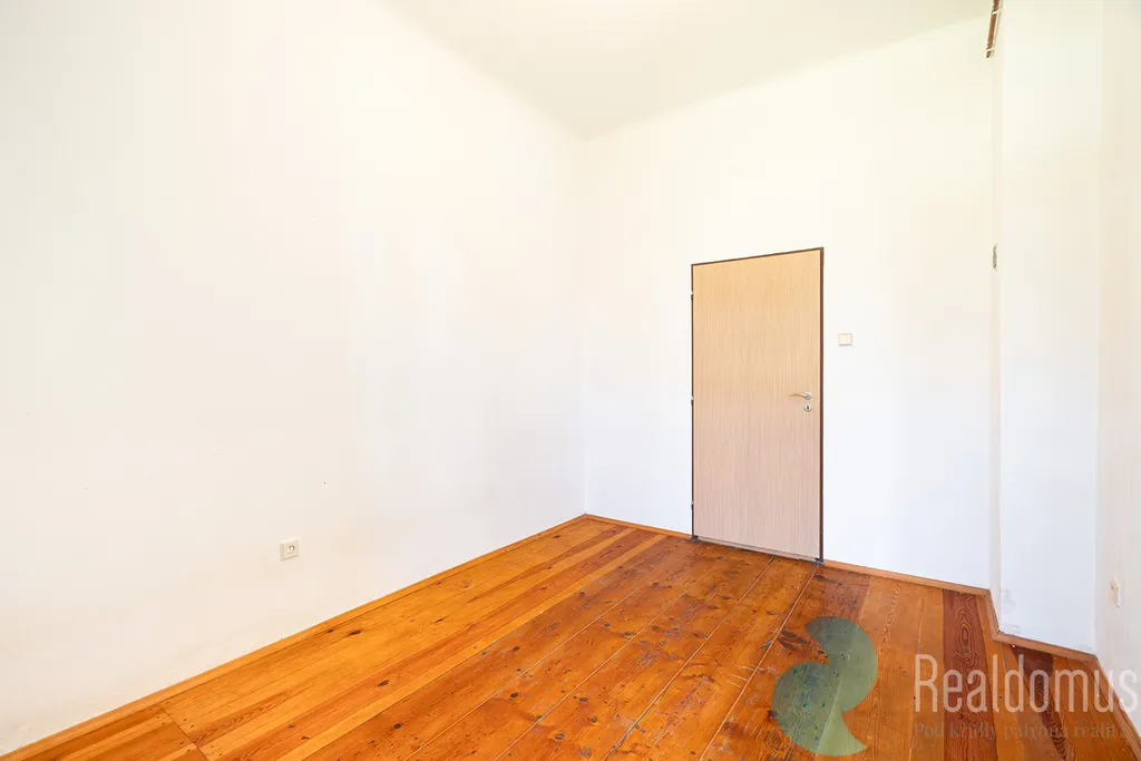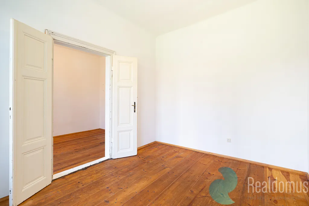 Byt disponuje prostorným obývacím pokojem orientovaným na jih, ložnicí a dětským pokojem situovanými na severní stranu s výhledem do zahrady. Kuchyně je samostatná, dále koupelna s WC. Kuchyňská linka je určena k rekonstrukci. Na podlahách jsou původní dřevěné parkety, které lze krásně zrenovovat, a vysoké stropy dodávají bytu vzdušnost a eleganci. Vytápění zajišťuje úsporný kondenzační plynový kotel. K bytu dále náleží sklep o výměře 10 m2.