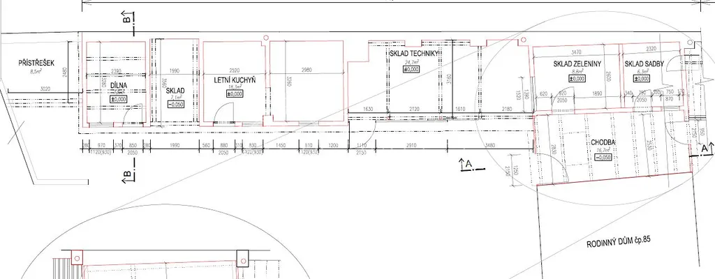 Dům má zastavěnou plochu 199 m2. Na dvoře garáž, dílna, sklad, kůlna a skleník o další celkové ploše 173 m2. Velikost pozemku 1483 m2.