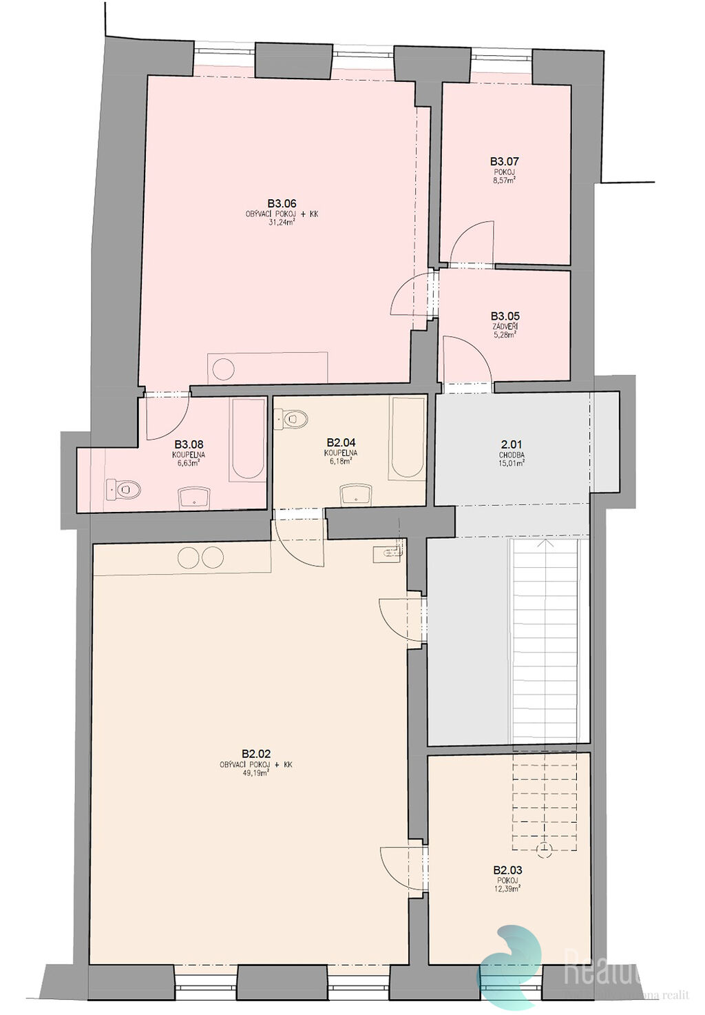 - V prvním patře jsou dva byty 2+kk (52 m2 a 67 m2) interiérově upravené přibližně před 15 lety. Elektřina i ostatní rozvody v těchto jednotkách jsou v původním stavu.