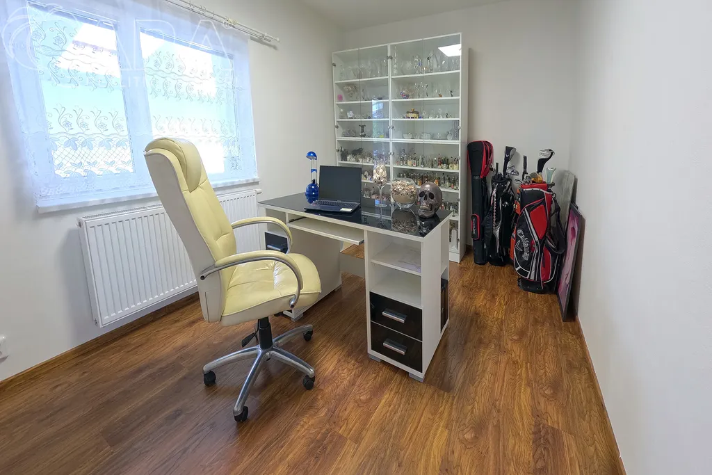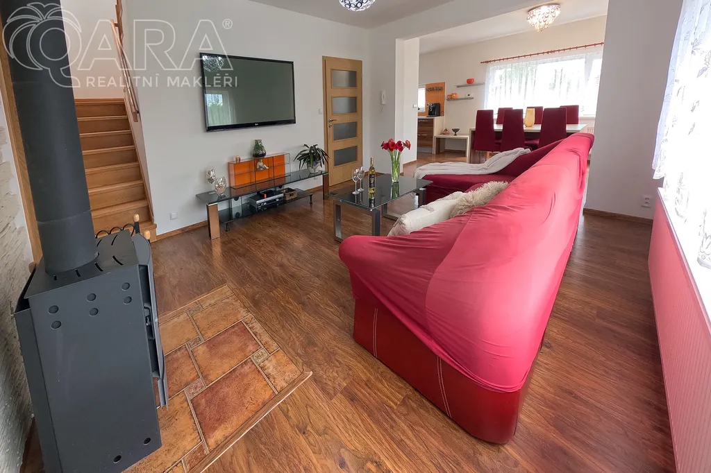 Srdcem domu je obývací pokoj s krbovými kamny a jídelna prosvětlená velkými okny. Na ni navazuje kuchyně se spíží. Dále tu naleznete pracovnu a koupelnu se sprchou.